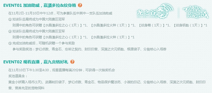 《龙之谷》在今年12月初将迎来DWC嘉年华,而此次嘉年华中的重头戏便是DWC全球赛。齐聚世界范围内的顶尖DN高手,届时共6支队伍将在中国·上海一展风采。中国大陆赛区的精英PK玩家们,将率先于11月10日的成都迎来国内巅峰对决。通过层层选拔而出的《龙之谷》PK玩家们,将会有怎样的表现?为选手们加油助威,就有感谢礼哦! DWC中国大陆赛区总决赛 成都站谷迷面G会>>>(链接:http://act2.dn.sdo.com/Project/20181110cd/Default.aspx) 线下面G,也超燃! 相较于PVE,热爱PVP的谷迷们或许更沉迷于瞬息万变的战场,灵活多变的打法,每一次与不同对手的对战都能激起不同的新鲜与刺激感。在11月10日的成都,《龙之谷》将举办2018年的第四次“谷迷面G会”。经历了广州站,北京站,又在杭州度过了八周年生日派对,在这次的成都站中,不仅是谷迷的线下面基,更是DWC中国大陆赛区的决赛现场!吃好,玩好,与GM面对面,现场气氛更是超燃! 加油助威,全民DWC! 从今天开始到11月9日24点,玩家登录《龙之谷》成都站谷迷面G会页面,在参赛队伍中可以选择任意一支参赛队伍进行加油助威。如果加油助威的队伍最终成为中国大陆赛区的冠军,则猜中的角色可获赠水晶潘多拉之心*1、水晶潘多拉火种*1、纹身箱*1、纹身钥匙*1。如果加油的队伍并没有成功登顶,而是获得了亚军,则猜中的角色可获赠水晶潘多拉之心*1、水晶潘多拉火种*1。每个账号内的任一95级角色均可参与,全民DWC,走起!支持队伍后,还能随机收到一份助威感谢礼,梦幻点数、青金石、封印印章、分裂核心入场券等等奖励,超实用哒! 观看直播,抽好礼! 场上燃情战斗,场下及场外的观众当然也要一起嗨。在11月10日下午13点30分至16点30分期间,在成都站谷迷面G会页面观看现场直播每满20分钟,就能获得一次抽奖机会,满级角色专享,每个账号内的任一95级角色可参与。除了小淑的印记,深渊之次元钥匙,物品保护魔法药,武器刻印袋子外,谷迷们每天心心念念的黄金小妖精币也赫然出现在了奖池中!有木有很惊喜?有木有很意外?在13点30后登录该页面的谷迷,默认就拥有一次抽奖机会,千万千万不要错过鸭!BUT,更不能错过精彩的各场比赛哟! 《龙之谷》DWC中国大陆赛区总决赛仅剩一周时间,今天开始,为参赛选手加油助威就能免费抽取好礼,11月10日当天观看直播,更有机会获得黄金小妖精币!为热血鼓掌,为激情点赞!成(xiong)都(mao)!我们就要来啦! 《龙之谷》“万圣狂想曲”版本更新! 落日回廊挑战不断!女神防具助成长! 六人小队勇气之征!试炼巢穴格拉诺! 医疗时装守护大陆!剧毒翅膀三件套! 飞马坐骑阶段养成!英气逼人属性强! 万圣狂欢福利满载!即刻上线领大奖! 《龙之谷》客户端下载地址: http://dn.sdo.com/web10/down/game.asp 开启撩GM的新方式!扫一扫关注龙之谷全新微信订阅号,有奖活动一手信息全部轻松GET: 参与互动及讨论,请关注龙之谷官方微博: http://weibo.com/doublekill 了解玩家同人文化,请关注龙之谷官方同人小站微博: 微博:http://weibo.com/u/5995646551 了解更多相关信息,请前往http://dn.yzz.cn/ |