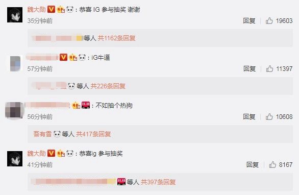 iG老板王思聪今天发微博称,为了庆祝iG在《英雄联盟》S8全球总决赛夺冠,他本月内会举办四次抽奖活动。第一波是在转发/评论/点赞中抽取113个人(11月3日),每个人可以收到一万元现金。目前这条微博共有80多万评论,转发数更是高达150万。