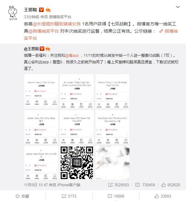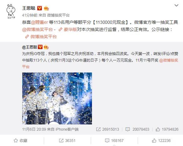 为了庆祝iG战队在《英雄联盟》S8全球总决赛夺冠,iG老板王思聪之前曾豪掷113万元在微博举办抽奖活动,而今天他也正式揭晓了这113位“锦鲤”,他们每人将获得1万元现金奖励。 截止开奖前,王思聪的抽奖微博共获得了2691万次转发,2007万条评论以及1979万个赞。随着中奖名单的公布,王校长再次包揽了微博热搜榜的前两名,有网友在打开公示链接时发现报错,还调侃称自己“连看看谁中奖的资格都没有”。 另外,王思聪今天还开奖一套iG战靴,七双鞋总价值近七万元,而获奖者只有一位。网友们在表示“羡慕嫉妒恨”的同时,也不忘转发中奖者的微博“蹭欧气”。 |