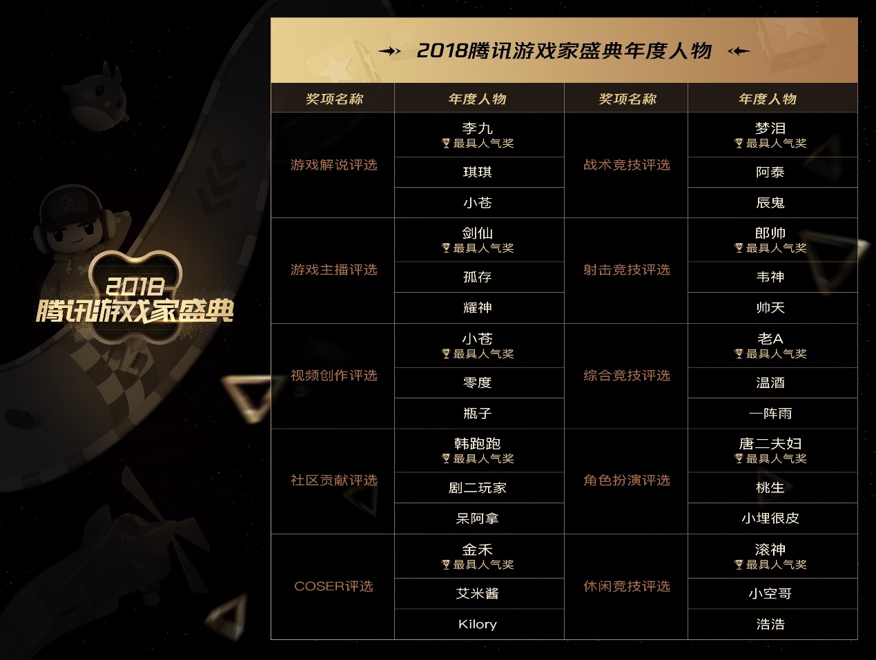 2018腾讯游戏家盛典11月18日在上海顺利落下帷幕。此次活动由腾讯游戏家联合英特尔、腾讯游戏玩家联盟共同举办,现场,腾讯游戏副总裁崔晓春先生向游戏行业精英呼吁:通过自身影响力和关注度,担当社会责任,传递正向精神价值。现场还为李九、小苍、剑仙、梦泪、郎帅等数十位知名玩家颁发了“年度人物最具人气奖”。 一、是荣誉更是担当 在盛典现场,崔晓春先生呼吁:在场的各位游戏界的明星,有不少粉丝已经上百上千万了,这个影响力并不亚于一些一线的娱乐明星。这个社会给予了我们这么大光环、影响力,我们是不是也应该通过我们的能量,为这个行业,为这个社会做点什么?这也是对粉丝、对行业、对社会的责任和担当。他表示:一些主播在游戏直播过程中,通过自己逆风翻盘的操作,鼓励粉丝,无论是游戏或者生活,遇到挫折都不要轻言放弃。一些职业选手,通过自己多年的努力最终获得他所在领域的最高荣誉,这也在鼓励着粉丝,无论是游戏还是生活,追逐梦想的道路上,我们都需要勇敢、坚持、自信,这正是我们所要传递的正向精神。他希望,所有的游戏行业从业者都不要忘记,自己身上的责任和担当,而未来腾讯游戏家也会与大家一起,传递正向精神价值。 二、 创作星年度人物最具人气奖评选结果公布 本次盛典,腾讯游戏副总裁黄凌冬、腾讯游戏副总裁崔晓春、天美L1工作室运营总监王怡文、腾讯互动娱乐市场平台部总监陆金贤、腾讯互动娱乐用户平台部总监张皓出席并揭晓了创作星年度人物最具人气奖评选的最终结果。其中,小苍获得“视频创作年度人物最具人气奖”,剑仙获得“游戏主播年度人物最具人气奖”,李九获得“游戏解说年度人物最具人气奖”,韩跑跑和金禾则分别获得“社区贡献年度人物最具人气奖”和“COSER年度人物最具人气奖”。 现场,获得“COSER年度人物最具人气奖”的金禾还为观众演唱歌曲,歌声带着对梦想的执着,对成长的信念,唱出了很多人的心声。 三、游戏家年度人物最具人气奖评选结果公布 此外,北极光工作室群蜜獾工作室总经理蒋毅、上海天美T1工作室总经理单晖、《穿越火线》制作人陈侃、企鹅电竞产品中心总监崔津源、《QQ飞车》制作人刘晶也出席现场,并分别为唐二、滚神、郎帅、梦泪、老A颁发了“角色扮演类年度人物最具人气奖”、“休闲游戏类年度人物最具人气奖”、“射击竞技类年度人物最具人气奖”、“战术竞技类年度人物最具人气奖”、“综合竞技类年度人物最具人气奖”。 现场,获得“休闲游戏类年度人物最具人气奖”的滚神还向观众表演了《节奏大师》的游戏操作,稳定的节奏感和极快的手速,让现场观众都赞叹不已。 四、多个独立奖项评奖结果公布 2018腾讯游戏家盛典除了揭晓“年度人物最具人气奖”奖项,现场还颁发了四个独立奖项:年度玩家喜爱品牌、Gamerthon游戏家全能赛单场冠军、创作星(流量榜)年度人物最具人气奖、腾讯游戏角色大赏前三强。 近年来随着游戏人群的增长,很多传统品牌通过与游戏产品的合作,刷新了在游戏人群心目中的定位,深受玩家喜爱。同时,这些品牌也致力于不断升级玩家的游戏体验,为游戏行业贡献了巨大的力量。本次2018腾讯游戏家盛典颁布的年度玩家喜爱品牌的包括:英特尔冥王峡谷、vivo、浦发银行信用卡、肯德基、罗森、Monster、黑鲨。 2018年腾讯游戏家盛典携手英特尔,前期于心悦俱乐部App上推出了Gamerthon游戏家全能赛,通过线上游戏赛事考验参赛选手的睿智、团结、机敏、勇敢等多项游戏家属性,通关且用时最短者将获得冠军。盛典现场邀请了三位单场冠军代表予以表彰和颁奖。 现场还颁发了创作星年度人物(流量榜),用于鼓励勤劳创作的优秀创作者们,尤其是其中最努力的十位作者。他们在过去一年中,通过腾讯游戏玩家创作联盟平台进行内容创作与分发,十个人的累计有效播放量超过12亿次,是当之无愧的年度创作星。 此外,现场还公布了2018腾讯游戏角色大赏的前三强,腾讯游戏角色大赏是由玩家在线上票选出的最受欢迎的“游戏角色”,最终来自《地下城与勇士》的狂战士、《QQ飞车》的小橘子、《电击文库:零境交错》的御坂美琴获得前三强。 活动最后,腾讯互动娱乐用户平台中心副总监钟翼为本次活动所有年度人物予以颁奖和肯定,详细名单如下: 此次盛典中,年度人物最具人气奖评选及相关独立奖项的颁发,旨在通过这些在游戏玩家中有影响力的知名玩家,持续挖掘并向社会传播游戏的正向精神价值。感谢合作伙伴英特尔对本次活动的大力支持,英特尔i7为游戏而生!同时感谢腾讯游戏玩家联盟、企鹅电竞、腾讯视频、腾讯爱玩游戏、企鹅直播、触手直播、斗鱼直播、虎牙直播、火猫直播、KK直播、狮吼直播、熊猫直播、一直播、映客直播、爱奇艺直播、爱拍、游戏狗、太平洋游戏、锐派游戏、兔玩、叶子猪、百家号、王者荣耀机器人等对本次活动的支持。 |