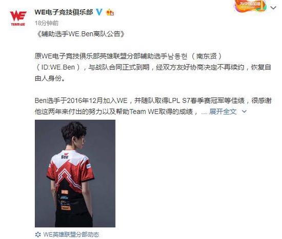 近日,LOL各大赛区的转会大幕纷纷拉开序幕。其中最为激烈的莫过于LCK赛区,众多强队分崩离析,甚至连SKT都面临解体,目前已有7人离队,仅Faker待定。 最能忍住的莫过于LPL赛区,大部分LOL战队都捂得很严实。没想到,第一个没忍住的却是WE战队,不过消息却是队员发布出来的。 11月20日,WE战队辅助Ben发布脸书消息:大家好,我是过去两年在WE战队担任辅助位置的Ben选手,我和WE的合约在2018年11月19日到期,现在开始希望接触更多的队伍。 据电竞知名人士丫丫的翻译,Ben的离队消息中,韩语有一段话令人扎心,Ben表示:怕大家万一不知道我是谁,我是2017年世界赛4强WE战队的挥舞着双手跟大家打招呼的辅助Ben。 为什么他会那么说呢?因为在2018年赛季,Ben几乎缺席了一年的比赛。“Ben为什么不上场打比赛?”,这样的疑问贯穿了整个赛季。 对于缺席的原因,WE战队多名人士层这样解释:因为尊重选手的个人意愿,因此Ben没有上场比赛。 对于BEN的离队,WE战队表示:很感谢他这两年来付出的努力以及帮助Team WE取得的成绩,并祝愿他在未来的职业道路斩获新的成功! 关于Ben这一名选手,他出生于1995年4月24日(年龄23岁),2016年7月于IG战队辅助位出道,2016年12月转会至WE战队,最佳成绩 — 2017年春季赛冠军、S7全球总决赛四强。而且多说一句,他的妹妹颜值真的很漂亮。 虽说2018年缺席赛程多时,但2017年他的整体表现相当不错,希望Ben在S9赛季可以找到心仪的队伍,前程似锦吧。 新浪声明:新浪网登载此文出于传递更多信息之目的,并不意味着赞同其观点或证实其描述。 |