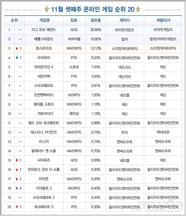 11月第三周的韩国网游排行榜榜单中,《失落的方舟》继续强劲表现,本周名次升至TOP 3。 根据韩国网游排行榜从11月12日至11月18日统计的数据显示,Smile Gate的MMORPG新作《失落的方舟》本周游戏时长较上周相比增长了55.9%,市场占有率达到12.12%,位列排行榜第3名。 失落的方舟 于11月7日正式开启公测的《失落的方舟》上线5日便稳居排行榜第4名,本周更进一步,超越《守望先锋》进入TOP 3。《失落的方舟》是《穿越火线》研发商Smile Gate历时7年研发的心血结晶,于2011年开始研发, 2014年在韩国G-Star游戏展上首度公开,共投资一千亿韩元制作(约合人民币6.1亿)。该作品结合高品质的游戏画面与武器对砍、角色培养等游戏特色,游戏具备可以使用多种特性来组合出个性技能的系统,自由航行在大海中,寻找全新岛屿和宝物的航海系统,克服俯视视角限制的多种演绎等特点。游戏公测时即推出战士系、格斗系、枪手系、魔法系四大职业体系,每个职业体系都有三个职业可供发展。 失落的方舟 《失落的方舟》本周最高同时在线人数突破35万,很多服务器呈现出排长队的情况。本月16日,该游戏开放了第九个服务器,Smile Gate表示,未来将继续推出新的服务器,并将对已有服务器进行扩容。 FIFA OL 4 除了《失落的方舟》,两款Nexon游戏,《FIFA OL 4》和《跑跑卡丁车》的游戏时长也较上周有明显增长,两款游戏的时长分别上涨29.6%和20.1%。在《失落的方舟》强势来袭的情况下依然能够保持高幅度增长,可见休闲竞技类游戏依然是韩国国民的“心头好”。 跑跑卡丁车 《暗黑3》本周游戏时长下滑19.9%,是TOP20游戏中下滑幅度最大的,游戏名次本周下滑3位,仅排在排行榜第18名。 暗黑3 《英雄联盟》的游戏时长较上周相比下滑了4.7%,但是市场占有率依然超过30%,稳居排行榜榜首。游戏官方近日公布了新法师英雄“万花通灵妮蔻”的预告片,妮蔻可以将自己伪装成一个友方英雄。造成伤害、承受敌方英雄伤害、施放Q或E时会解除并提高冷却时间。 英雄联盟 11月12日至11月18日韩游TOP 10排名: 榜单中文 榜单韩文 |