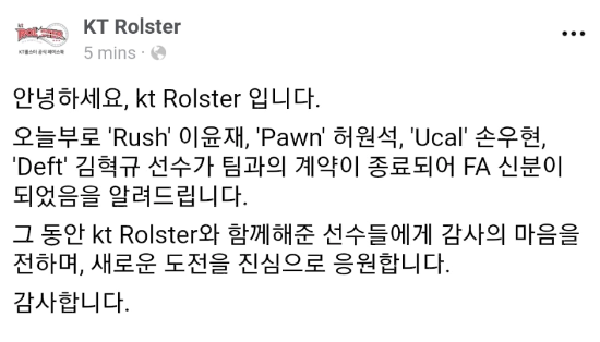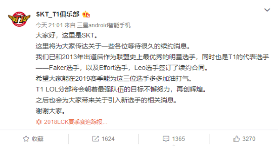 《英雄联盟》LCK赛区转会期已经开始,SKT T1战队此前公布了7名队员离队的消息,又于昨晚宣布,Faker及两名队友Effort、Leo签订了续约合同,将继续留在SKT征战S9。 微博原文: “大家好,这里是SKT。 这里将为大家传达关于一些各位等待很久的续约消息。 我们已和2013年出道后作为联盟史上最优秀的明星选手,同时也是T1的代表选手——Faker选手,以及Effort选手,Leo选手签订了续约合同。 希望大家能在2019赛季能为这三位选手多多加油打气。 T1 LOL分部将会朝着最强队伍的目标不懈努力,再创辉煌。 之后也会为大家带来关于引入新选手的相关消息。 谢谢大家。” 此外,LCK赛区今年成绩不佳,除了SKT的人员变动,韩国的另一支强队KT也宣布了Rush、PawN、Ucal和Deft离队的消息,看来整个LCK赛区的俱乐部队员构成即将迎来一波大换血。 更多相关资讯请关注:英雄联盟专区 |