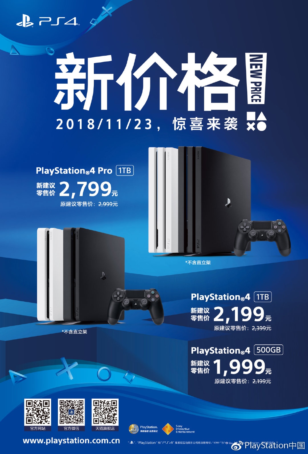 索尼今日宣布国行PS4(1TB)、PS4(500GB)以及PS4 Pro(1TB)将以新建议零售价发售。 PS4(500GB)的原价为2199元,目前新建议零售价为1999元。 PS4(1TB)的原价为2399元,目前新建议零售价为2199元。 PS4 Pro(1TB)的原价为2999元,目前新建议零售价为2799元。 新建议零售价将于11月23日生效,感兴趣的玩家也可以趁此机会入手PS4主机了。 |