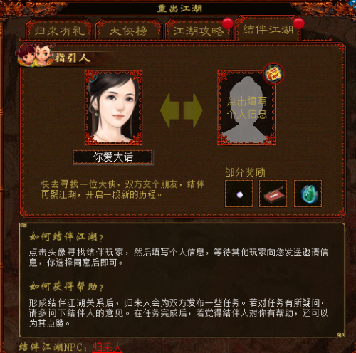 十六年大话时光,从东海渔村懵懂相遇,到同心树下缔结良缘,帮战并肩肝胆相照,大话江湖里满是兄弟们的情义篇章。不管曾经因何而暂别江湖,兄弟归来再续江湖情义,老友回流系统升级上线,多重壕礼、玩家帮派兄弟相助、精华攻略等邀你重回大话! 广邀江湖大侠助力回归 交友升级两不误 兄弟归来,游戏生疏好友不在?怀念曾经与兄弟并肩作战的日子?无需担心,新版老友回流系统两大维度解决老友顾虑,“结伴江湖”帮你快速寻找绑定江湖好友;丰厚奖励广邀江湖大侠助你回归!回流玩家登陆游戏即可填写、发布结伴信息,系统将根据填写信息匹配推荐“江湖大侠”助你回归;更有好友、夫妻、帮派三大锦囊助你快速结交江湖新友,共同闯荡江湖,不再单打独斗!遇到相对困难的剧情任务还可发布求助,系统提供丰厚大侠值邀约江湖大侠帮你闯关! 超值壕礼携精华攻略送上 开启全新江湖之旅 日常在线、升级任务、结交好友均可获得丰厚奖励,精选实用攻略助你再次熟悉江湖。大话2经典版老友归来,只要在线时间满足指定要求,即可享经验Buff、能力Buff、成长值、专属聊天标志、体验飞行器、免费改名券、转种族优惠券、随机礼品等超值壕礼;带队完成“鬼王”、“修罗”、“宝象除魔”等日常任务领取人物经验、成长值、福源广泽盒等物品奖励;完成好友、夫妻、帮派三大锦囊的指定任务即可领锦囊好礼!每一个游戏必经的小细节,都有各色各样的惊喜奖励等着你!更有游戏内种族任务装备推荐、专题全任务攻略助你再战三界,开启全新江湖之旅! 一款游戏,一生朋友,这个江湖不孤单。老友回流系统现已携多重壕礼升级上线,赶紧重回江湖和大话兄弟们一起并肩作战再续情义吧!更多活动细节,丰厚奖励内容,请点击专题查看:http://xy2.163.com/huiliu/dd/ 《大话西游2经典版》,国风经典,亿万口碑扛鼎之作!官网:http://xy2.163.com/ 《大话西游2免费版》,绿色免费,轻松赚钱,经典再临!官网:http://dh2.163.com/ 《大话西游2口袋版》,满分经典,指尖还原!官网:http://xy2.163.com/koudai/ |