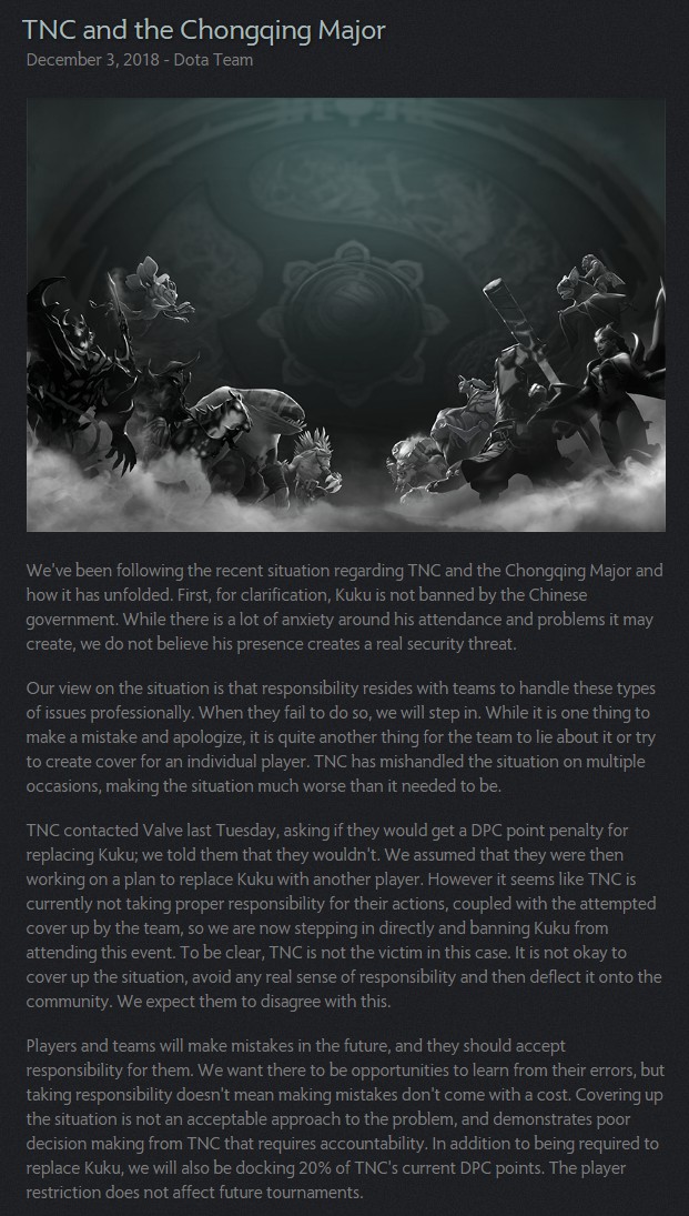 昨天,《Dota2》辱华选手KuKu所在的TNC战队发推称,受到重庆Major主办方间接威胁,如果Kuku参赛可能无法保证人身安全。今天,V社官方发布了一则公告,针对相关事件作出明确说明,V社明确Kuku并没有被中国主办方禁赛,但TNC战队不仅没有好好处理此事,反而还撒谎试图掩盖事实逃避责任。最终V社决定禁止Kuku参加重庆Major,TNC战队扣除20%积分。 首先V社明确Kuku并没有被中国主办方禁赛,尽管他出席比赛可能会令人不安,但V社并不相信会存在什么实质上的安全威胁。V社方面的想法原本是让战队去更专业地处理这类问题。如果战队没有这么做,那么V社就会接入。 虽然之前Kuku犯了错并道了歉,但战队却试图撒谎来帮他掩护。TNC战队错误地处理了这件事,让情况变得越来越糟糕。 TNC上周二和V社取得联系,询问是否会因为换掉Kuku而扣除DPC积分,V社以为他们正在考虑用其他选手替换掉Kuku。然而显然TNC并没有对他们的行为负责,反而想掩饰过去,因此V社现在直接接入,禁止Kuku参加重庆Major。并且V社强调,TNC不是受害者。在这种情况下,逃避责任,掩盖真实情况,煽动玩家,这是不可取的。 V社最后还表示,玩家和战队未来也有可能犯错,但犯了错误就应该负责,希望能够从中吸取教训。同时V社表示承担责任并不意味着犯错就是没有成本的了。TNC的方式显然不是解决问题的办法,最后还将对TNC扣除20%的积分。 |