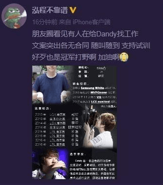 前世界冠军打野dandy 托人朋友圈发简历:中文流利,愿意试训!