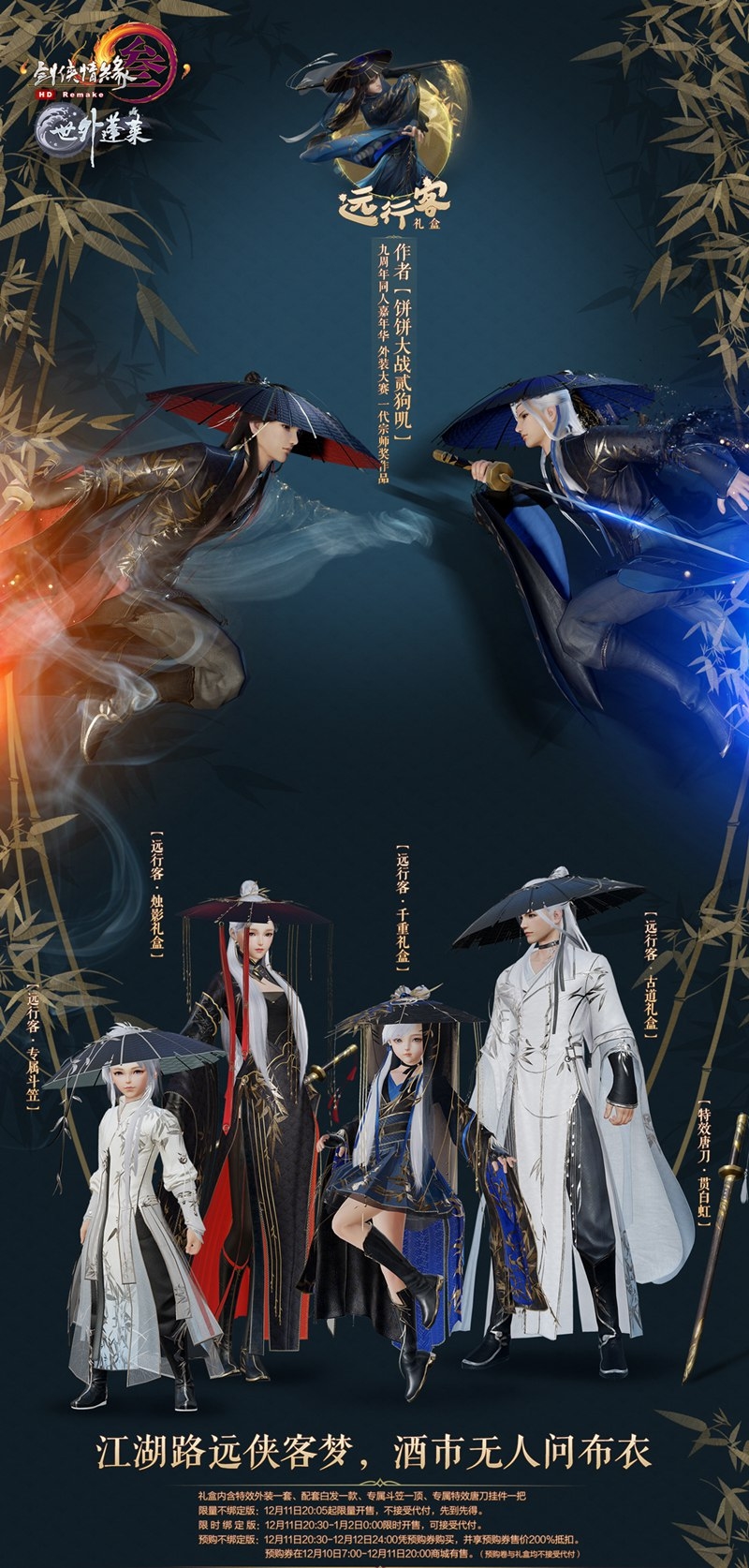 《剑网3》“双十二特惠惊喜狂欢”将于12月10日火爆开启!除了侠士们熟悉的全场5折捏脸、9折发型以及3倍积分限时优惠外,本次还将引入全新的礼盒预售以及“双十二惊喜下一单免单”等福利回馈活动!与此同时,在双十二活动期间还将上线“远行客·礼盒”全新侠客风格礼盒在精度和工艺上再创巅峰,以金错工艺配饰点缀勾勒,铸就侠客风骨,融竹叶刺绣与松柏暗纹巧修纹理,彰显竹柏气节!配套唐刀,冷锋出鞘,竹影留香,进一步彰显侠客本色!除此之外,“凤舆龙驾”“天河对影”两套经典外观将进行换季促销,全新的格突破,铸就服饰新灵魂! “双十二”专题链接:https://jx3.xoyo.com/zt/2018/12/12/double12/index.html 【江湖路远侠客梦 古风侠客礼盒诚意献礼】 “竹露点苍翠 古道书生平。”《剑网3》九周年同人嘉年华-外装大赛-一代宗师奖作品“远行客·礼盒”将于今日正式上线!礼盒在制作上遵循了作者所希望表达的江湖侠客风格,以翠竹作为主打设计元素,整体款型修身轻便,简约大方,提刀挥舞间宛若行云流水,潇洒俊逸!在外装在搭配上,更是融入了许多侠客的经典搭配,配套唐刀、斗笠,松柏底纹搭配竹林暗纹描绘,辅以金属点缀,使得服饰整体展现了侠之大者的独特风范!是谓江湖路远侠客梦,酒市无人问布衣。 “远行客·礼盒”内含特效外装一套、配套白发一款、配套帽子一顶、动作特效佩刀“贯白虹”,以斑驳竹影镌刻其上,冷锋如月,刀穗飘摇。挥舞间,竹林毕现,竹叶纷飞,侠客可扶摇其上,潇洒自如。正所谓是“虹贯九州何处客?重义轻生一刃知。” “远行客·礼盒”分为红色、蓝色、白色三款偏色,分别对应“远行客·烛影礼盒”、“远行客·千重礼盒”、“远行客·古道礼盒。” 售卖时间: ·“远行客·烛影礼盒”限量不绑定版(红色款):12月11日 20:05,每款限量销售5,000套(电信4,000套,双线1,000套),售价58,800通宝,不可代付; ·“远行客·千重礼盒”限量不绑定版(蓝色款):12月11日 20:10,每款限量销售5,000套(电信4,000套,双线1,000套),售价58,800通宝,不可代付; ·“远行客·古道礼盒”限量不绑定版(白色款):12月11日 20:15,每款限量销售5,000套(电信4,000套,双线1,000套),售价58,800通宝,不可代付; ·“远行客·礼盒”限时绑定版:12月11日20:30-1月2日0:00限时售卖,每款礼盒售价58,800通宝,可代付; ·“远行客·礼盒”预售不绑定版:12月11日20:30-12月12日24:00,只有预售资格才能购买,每款礼盒折后售价548,000通宝,不可代付; ·开放“远行客·礼盒”预售不绑定版,侠士可于12月10日7:00-12月11日20:00期间购买预购券,预购券可用于激活预售版购买资格,在购买时将以200%预购金额进行抵扣,预购券每张售价2,000通宝(即在购买时可抵扣4,000通宝),每位侠士可购买多张,每单仅可使用一张预购券; ·“远行客·礼盒”配套黑发将单独进入发型商城,售价10,000通宝,可支持代付。 【天河架舆龙凤影 复刻外观换季上架】 全新推出的换季复刻外观“凤舆龙驾”与“天河对影”,两款复刻各有两种偏色。在保留原有款型的同时,融入了全新的设计元素,复刻版“凤舆龙驾”一改原版的华贵设计,以朴素简洁的设计封国,实现了服饰整体的颠覆性创新!而复刻版“天河对影”则添加了冬季与皮草的元素,使得服饰整体变得更加俏皮与温暖。 售卖时间: ·“凤舆龙驾”“天河对影”两套经典外观将进行换季促销,12月10日7:00维护后原版享受9折优惠,并将于12月17日7:00换季下架; ·“凤舆龙驾”“天河对影”复刻版将限时上架,每套外观均有2种偏色,售价20,000通宝,将于12月10日7:00-1月2日0:00限时销售。 【诸多嗨翻天 折扣活动大返利】 在12月10日7:00-12月12日24:00期间,侠士在全区全服消费,购买发型即可享受9折优惠,购买易容脸型可享受5折优惠,更有300%积分限时回馈诸位侠士!同时,还将开启“双十二惊喜,下一单免单”的全新运营活动。侠士但凡在双12活动期间每次在商城内购买商品(捏脸、实物、代付除外),将有机会触发下一次消费免单返利,每次消费金额越高,触发下一单免单概率越高!成功触发下一次消费免单后,账号任意区服角色下一次购买商品(捏脸、实物、代付除外)所消费的通宝将获得返还,最高返还限额200,000通宝(2000元),并分期返还,一个账号仅可获得一次免单机会。 【预购券200%返利 购买新姿势解锁】 新增“远行客·礼盒”预售不绑定版,侠士可于12月10日7:00-12月11日20:00期间购买预购券,(预购券不可代付,且将于12月13日0:00消失,未使用不退款)预购券可用于激活预售版购买资格,在购买时将以200%预购金额进行抵扣,预购券每张售价2,000通宝(即在购买时可抵扣4,000通宝),每位侠士可购买多张,每单仅可使用一张预购券。侠士在商城购买预购券道具,在使用后即可选择“远行客·礼盒”预售不绑定版三种偏色中的其中一种偏色进行购买,购买资格可累加多次;同时,侠士还可获得预售资格查询道具,使用后可查询当前角色所对应三颜色的对应预购资格次数。 【12月充消曝光 定制可弹奏特效背挂上线】 侠士们于12月参与充消活动,可根据充消金额获得腰部挂件“坠红”、背部挂件“即离”,腰部挂件“孤泊”、背部挂件“蝶魄”奖励。此外,第五档奉送可弹奏特效背部挂件“寄情”,琵琶声起,以曲寄情。正可谓江波摇影舟幕红,烟水楼台渺千重。玉人应向无情寄,何以弦起错落声? 12月充消奖励如下: 60元/180元:腰部挂件“坠红”或