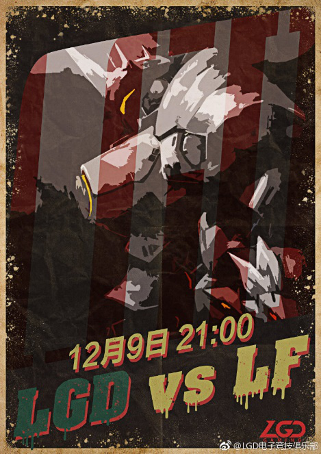 《守望先锋挑战者系列赛》(中国)的常规赛还有最后一周就要结束了,每支队伍之间的竞争也如火如荼,这种竞争不仅存在于赛场之上,也蔓延到了每支队伍场下后援,连海报都已经成为了他们竞争的赛场。也涌现了一批美工鬼才。 (Team CC战前海报) 这是Team CC与LAB对决前公布的宣传海报,海报上两支队伍的拟人化极其形象,在LAB的图标的后面还有ZOO与TSL的对标,这是在前两周已经被Team CC击败的队伍,现在轮到了LAB,让人感觉Team CC大喊:“我要打三个!”的威壮气势。也在比赛前就给LAB看一看自己已经击败的队伍,立一个下马威。 (LGD战前海报) 这是LGD的战前海报,甚至还在微博配文“东风吹,战鼓擂,LGD硬仗怕过谁。”LGD也意识到了与LF之间会是一场硬仗。在莱因哈特的盾上写上“LGD”三字,展示了他们对于能像他无畏冲锋,也能用自己坚固的护盾接下LF的攻势赢下这场比赛。莱因哈特犀利的眼神貌似在看着盾前的攻击者给予他们眼神威慑。弱者退散。 (LGE战前海报)