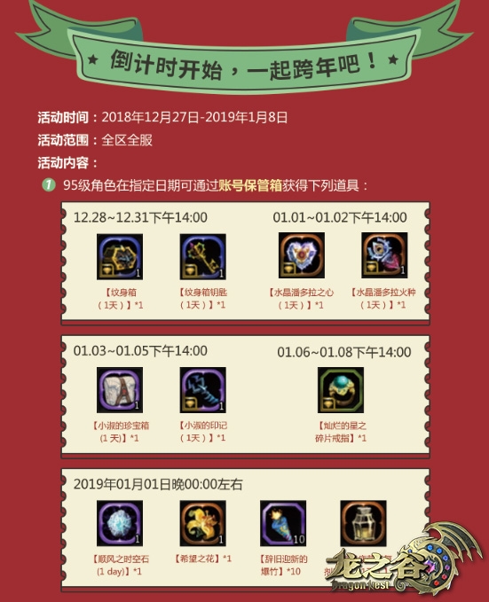 最近的《龙之谷》可谓欢乐多多,12月上旬DWC嘉年华圆满落幕,在12月21日落幕的中国“游戏十强”盛典中,《龙之谷》更是一举夺得年度十大最受欢迎电脑网络游戏奖。在圣诞节版本更新后,版本更新福利、圣诞兽人的宝箱等等众多全民福利,让谷迷们嗨个不停。从今天开始,《龙之谷》元旦活动正式上线,一起跨年领好礼!全新兽娘职业也已预定将在1月末更新,有奖征名活动将在本周五推出哦。 元旦倒计时!福利活动即日起开始 1月8日前,95级角色上线后就可以通过账号特殊保管箱获得各类跨年福利。水晶潘多拉礼包、纹身箱礼包、小淑的珍宝箱、小淑的印记、灿烂的星之碎片戒指,每天登录就能获得相应奖励。1月1日,《龙之谷》还将为大家送上跨年福袋,希望之花、疲劳恢复剂、顺风之时空石,还有辞旧迎新的爆竹,给大家营造满满的跨年氛围哟!1月1日下午16点,全区全服还将陆续清空巢穴次数,Fun肆High玩就这么简单! 提升自我NOW!刷图送保护药,参与森林龙巢穴送园龙鳞片 新年新气象,提升自我能力值,从现在开始!1月8日前,通关火山巢穴、迷雾巢穴、守卫者巢穴指定层数≥1次,就可以在次日获赠梦幻点数、保护药、刻印袋子、秘境圣物等不同通关奖励。如果活动期间累计通关分裂核心任意层数≥7次,更可以在活动结束后获得5个希望之花。勇往直前但是无奈角色能力值目前仍有限?在1月8日前,累计参与森林龙巢穴≥2次,就可以在活动结束后获得20个园龙鳞片,如果累计通关森林龙巢穴≥1次,活动结束后就能获得50个园龙鳞片,可以说是大大加快了《龙之谷》谷迷们的成长速度,相当美滋滋咯。 休闲挂机送好礼!买赠累消也有好礼 元旦有各种节目,抽不开身在阿尔特里亚大陆上进行冒险?没关系!无论是休闲党,还是剁手族,《龙之谷》挂机活动和买赠累消活动,也已经为大家准备好啦!1月8日前,满级角色累计在线时长≥15小时,且钓到黄金鲤鱼≥20条,就能在活动结束后获得龙鱼*5,七鳃鳗*5。钓鱼时欧气不足没关系,挂机活动送给你超珍贵FISH。不同的累计在线时长,并完成指定钓鱼数量条件,还能获赠女孩纸交换券、神秘的变身帽子礼盒、务农之高级鱼饵。1月1日至1月8日期间,当日购买指定道具,次日可获得希望之花袋子、潘多拉礼包、变换礼包等。消费达到指定额度,将可获得天使守护星三件套,温暖冬季中,华丽蜕变为时尚ICON。 《龙之谷》元旦福利多到爆炸,12月27日至1月8日期间,只要上线,就有好礼!1月末,全新兽娘即将入谷,本周五开始,用自己的创意和才华,定义新兽娘! 《龙之谷》“圣诞奇妙夜”版本更新! 冒险家公告栏!勇士养成惊喜不断! 圣诞节三件套!无尽永夜晶莹璀璨! 新一季天梯赛!全民福利大陆探险! 超可爱蘑菇套!救赎时装返场惊艳! 一月末已定档!全新兽娘无敌酷炫! 《龙之谷》客户端下载地址: http://dn.sdo.com/web10/down/game.asp 开启撩GM的新方式!扫一扫关注龙之谷全新微信订阅号,有奖活动一手信息全部轻松GET: 参与互动及讨论,请关注龙之谷官方微博: http://weibo.com/doublekill 了解玩家同人文化,请关注龙之谷官方同人小站微博: 微博:http://weibo.com/u/5995646551 了解更多相关信息,请前往http://dn.yzz.cn/ |