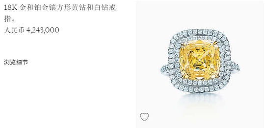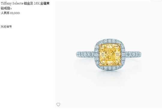 随后笔者也是在TIFFANY官网中找到了和Doinb求婚戒指款式较为相似的两枚钻戒,这才知道原来Doinb送给糖小幽的是非常稀有的黄钻戒指。其中,价格低的一款是83000元。