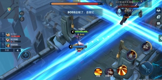在这个新模式中,遇到安琪拉大熊是其中的一个惊喜。要想通过关卡,那么必须打掉最终的boss,这个日之塔新模式与之前模式不同,唯一的就是奖励物品以及玩法机制不一样。boss会释放技能,可以看到这么大的激光条直接扫射安琪拉的大熊,还好这是简单模式,如果是困难模式,英雄不佩戴装备,那根本就是被秒杀。