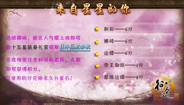今日17时,《征途》“人气服二十区”燃情开启!2019年度首个新区,老友重聚,再战征途!本次新区除保留全民送全套15星装备、直升202、消费大返还三大特权,还将推出“天降财神红包雨+白金卡天降鸿福+天降工资红包”、“摇钱树”等专属福利活动! 此外入驻新区,完成签到、日常任务,就能免费获得“15星升星石”、“永久恭福熊猫”、“全套自选紫色马装”、“儿女锤锤”、“永久唐装/旗袍”、“永久土著时装”等奖励!还有5000元点数卡、25%攻击百炼石顶级大奖等你来抢! 点击查看新区详情(http://zt.ztgame.com/html/news/133f0ec/006-1545-01234-992783.shtml) 经典好礼 福利惠及全民! 今日开启的“人气服二十区”玩家,都可享受多重经典好礼,福利惠及全民! ■上线领全套15星装备:免费领取一套(11件)15星202级装备!人人有! ■上线直升202 :新区玩家直升202级,免除升级的苦恼! ■上线礼包领全套神器:领取开区礼包,打开就可获得珍稀奖励,完成个人成就还可领丰厚好礼! ■征途历史消费大返还:符合要求的老玩家在新区玩游戏,将获得该账号征途正式版游戏累计点卡消费的全额返还,最高可返还2万元红包点数!可在红包商场入手多种珍稀道具! ■每日登陆签到:活动期间,玩家每天登陆游戏都可领取珍稀游戏道具奖励,连续登陆20天就可领取大量珍稀道具,全方位满足你的游戏需求! ■新区历练:动期间,玩家每天上线均可完成一项历练任务,完成全部6项历练任务就可领取永久金鳞天狼等豪华大礼! ■来自星星的你:凡是成功预创建的玩家,在开区前都能获得相应的星星积分。开区后,玩家完成特定日常任务和消耗指定道具也可以获得星星积分,累计积分达到要求就可在NPC福神处领取升星石,最高可领取15星升星石! 战火燎原 以战养战太激情! 新区福利满满之余,还将给大家带来多种火爆刺激的战斗玩法,以战养战,节省消耗的同时,还能体验新区的激情和爽快 ■新区职业争霸赛:活动期间每周六举行,系统根据战力划分赛段,每个职业鉴定前100名为帝级赛段,第101-200名为王级赛段。帝级前100名、王级前20名均可获取大量珍稀道具奖励,随风、奥法、枪、神羿、仙魔、武圣六大热门职业,每周帝级比赛前3名还可分别获得1000元至3000元不等的征途点卡大奖!千万不要错过哦! ■本区1V1争霸赛:开区一周天天开战,让你新区玩得更爽,PK更劲爆! ■新区斗战精英免费送多重豪礼:斗战精英,超值奖励等您来挑战!新区开启7天内,个人战力达到一定数值后,均可领取升星石大奖;战力达到50万的玩家还可获得“笑傲江湖称号”;战力排名第一的玩家还可额外获得“新人王”称号! 团队荣誉 兄弟姐姐人人获利! 在个人战斗和活动外,《征途》新区还推出多重与家族、帮会等团队相关的利好活动,让每一位兄弟姐妹都能通过集体玩法,获得利好! ■豪门争霸赛:激情对战,家族荣耀!新区豪门争霸赛火热开赛,除了原有道具奖励外,活动期间积分榜排名第1位家族的家族长,还将额外获得5000元征途点数卡!积分榜排名第2位家族的家族长还将额外获得2000元征途点数卡! ■善恶殿排名赛:截止2月3日24点,善恶殿本区排行榜排名前三位的家族长、名人堂本区排行榜排名前三位的玩家可以获得:3000元征途点卡(第1名)、2000元征途点卡(第2名)、1000元征途点卡(第3名)。 ■帮会、家族勇夺第一:在新区国战积分排行榜前5名的帮主将收到一份特殊大礼,内含100个可以交易的大礼包;新区“帮会繁荣度”排名前10的帮会,帮会内所有家族的族长,将会收到内含10个可以交易礼包的大礼,将它们分给任何对帮会做出杰出贡献的人,大家可一起分享游戏道具和乐趣! ■家族礼包全民回馈:活动期间,玩家每日都可获得家族礼包,家族兄弟姐妹在线人数越多,礼包奖励越丰厚! 此外,新区还有冲级达人、升级全民共享福利、天降工资红包等好礼等你来拿!今日17时,《征途》“人气服二十区”开启,快来一起迎战《征途》2019,领取至尊好礼! |