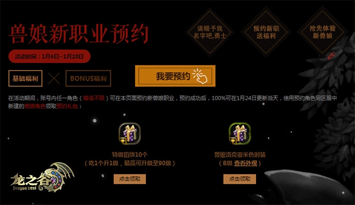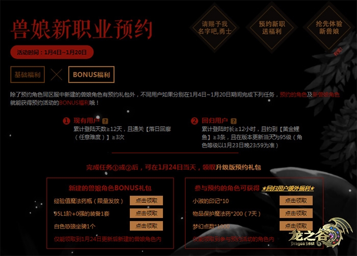 求新鲜?求刺激?甚至还在纠结什么福利适合你?本月末,《龙之谷》兽娘职业即将推出一条全新的职业分支,电磁炮武器超强力,征名活动火热进行中。而现在参加新职业预约活动,还有经验馅饼、时装、95L装备、材料等,轻轻松松为新版本的自己——谋福利! 预约活动 猛戳>>>(链接:http://act2.dn.sdo.com/project/201812zm/Default.aspx) 新兽娘入谷!这是一场电与光的博弈 兽娘新职业以等离子与电为媒介,对敌人进行强力爆破攻击,强劲的“未来科技”风格武器——电磁炮也将重磅登场!新职业其中的一类分支属近战职业,电、光属性,深受“敏捷”和“物攻”的影响,以动作性连击为特征,利用机械臂和等离子发射炮,近距离直接打击对手,打击感爆棚!而另一类分支则为光属性,强调辅助和灵活,更受“智力”和“魔攻”能力的影响,以中距离输出或辅助为主,利用等离子发射炮在中距离发射波导,攻击过程中获得的能源赋予队友或自己以更强劲的力量。这场电与光的博弈,各种心动期待有木有! 直升药水+永久时装!预约新职享福利 1月4日10点至1月20日24点期间,玩家账号内任一角色(等级不限)可在官网的预约页面预约新兽娘职业,预约成功后,100%可在1月24日更新当天,使用预约角色同区服中新建的兽娘角色领取基础预约礼包:【特级馅饼】*10以及兽娘的洛特亚米色时装,吃一个特级馅饼就可以升一级,最高可直接升到90级哦。 现有?回归?统统都有礼! 除了预约角色同区服中新建的兽娘角色有预约礼包外,不同用户如果分别在1月4日~1月20日期间完成任务,预约的角色及新兽娘角色就能获得预约活动的BONUS福利哦!【经验值魔法药瓶】、【95L1阶+0强的装备1套】、【白色恐狼坐骑一个】、【小淑的印记】*10,【物品保护魔法药】*200(7天)以及【梦幻点数】*1000!预约的回归用户更有额外福利,水晶三件套(30天)、最强攻击者称号(7天)、还有95L武器+防具7件套在等你! 新兽娘职业名,由你定义! 从12月28日起,《龙之谷》新兽娘的有奖征名活动已经正式开启啦。在活动期间,为新兽娘分支提供职业名称创意,最终被选用的职业名,第一个提交的角色可在活动结束后7个工作日内,获赠价值32800幸运币的【传说之水晶潘多拉礼包】一个,以及价值7880幸运币的【特殊纹身大礼包】*10,奖励real丰厚,快用你的创意和才华,定义新兽娘! 1月末,《龙之谷》即将更新兽娘新职业,不管你是喜欢拳拳到肉的打击感还是更青睐敏捷灵活的超强辅助,总有一个职业适合你!想要先人一步,抢占版本更新后的超多福利?现在就来《龙之谷》官网预约吧! 《龙之谷》“圣诞奇妙夜”版本更新! 冒险家公告栏!勇士养成惊喜不断! 圣诞节三件套!无尽永夜晶莹璀璨! 新一季天梯赛!全民福利大陆探险! 超可爱蘑菇套!救赎时装返场惊艳! 一月末已定档!全新兽娘无敌酷炫! 《龙之谷》客户端下载地址: http://dn.sdo.com/web10/down/game.asp 开启撩GM的新方式!扫一扫关注龙之谷全新微信订阅号,有奖活动一手信息全部轻松GET: 参与互动及讨论,请关注龙之谷官方微博: http://weibo.com/doublekill 了解玩家同人文化,请关注龙之谷官方同人小站微博: 微博:http://weibo.com/u/5995646551 了解更多相关信息,请前往http://dn.yzz.cn/ |