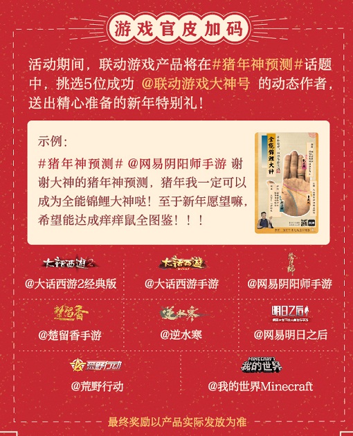 网易大神猪年运势神预测H5正式上线,丁三石化身江湖高手,黑科技为你掐指算命指点迷津!全能锦鲤大神、战力觉醒大神、资深团宠大神……想知道猪年你的运势如何,想喜提多重奖励?来网易大神收获新年新惊喜! 1月10日-1月16日,登录网易大神APP,在#猪年神预测#话题下体验H5,截图分享你的结果及新年愿望或flag,即可参与活动,赢取iPhone XS Max、网易游戏超级会员、游戏点卡等多重奖励。 (扫码体验H5) 【好礼一: 新年惊喜套装 承包你的猪年】 活动结束后,网易大神将在参与活动的玩家中抽取一名幸运儿,送出iPhone XS Max+“大有之年”赏猪吃肉年货礼盒+一年网易游戏超级会员,此外还将抽取10名玩家送出一年网易游戏超级会员,助你花式逆袭,变身游戏大神。 【好礼二:新年大福袋 好吃又好玩】 1月10日-1月16日活动期间,官皮每天将在#猪年神预测#话题下翻牌2位玩家,送出【新年福袋】一份,内含旺旺special大礼包、大神新年主题红包、趣味扭蛋等多重奖励,好吃又好玩的大礼承包你的猪年! @网易阴阳师手游 、@大话西游2经典版 、@楚留香手游、@网易明日之后、@荒野行动等官皮也将惊喜加码,只需在发布活动动态时@联动游戏产品,即有机会获得官皮们送出的精美礼品。 【好礼三:微信乐分享 豪送新年红包】 将H5结果页分享至朋友圈,并截图发送至网易大神微信公众号(官方微信:wyds_163)还可参与抽奖活动,1月17日,网易大神将抽取1名玩家送出iPhone XS Max,更有100份500点卡的新年红包等你赢取! 不仅如此,在网易大神APP中加入“网易大神真粉群”(群号:101046),就可以向官皮提出你的意见和建议,更有点卡、严选卡等不定时的福利掉落,快来化身大神真爱粉,应援赢奖励吧! 想要预知明年运势体验开挂人生,秀出你的逆天运势羡煞旁人吗?来网易大神,帅气丁爸在线看手相,给你新年新气象! 【关于“网易大神”】 网易大神是游戏玩家专属的兴趣社区。这里汇聚了广大精英玩家、游戏圈红人、行业大咖,集合了网易独家的官方资讯和福利趣闻,旨在为玩家打造一个丰富的游戏兴趣社交圈。玩家可以在网易大神与游戏中的好友实时聊天、多元互动;以游戏会友,结交更多游戏同好,和大神一起发现更多游戏乐趣。 官方网站:https://ds.163.com 官方微信:wyds_163 官方微博:@网易大神APP 官方大神号:@网易大神 |