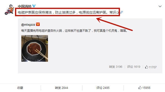 而没有想到的是,在隔了一天之后,“中国消防”就针对Mlxg这一次举动做出了正面的教育。“中国消防”发微博表示,“电磁炉表明应保持清洁,防止油渍过多,电源线应远离炉面。常识!”