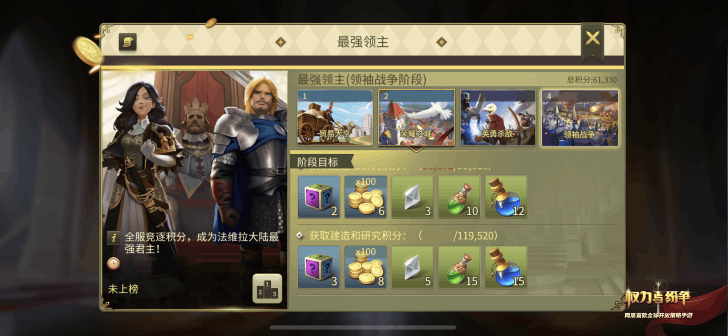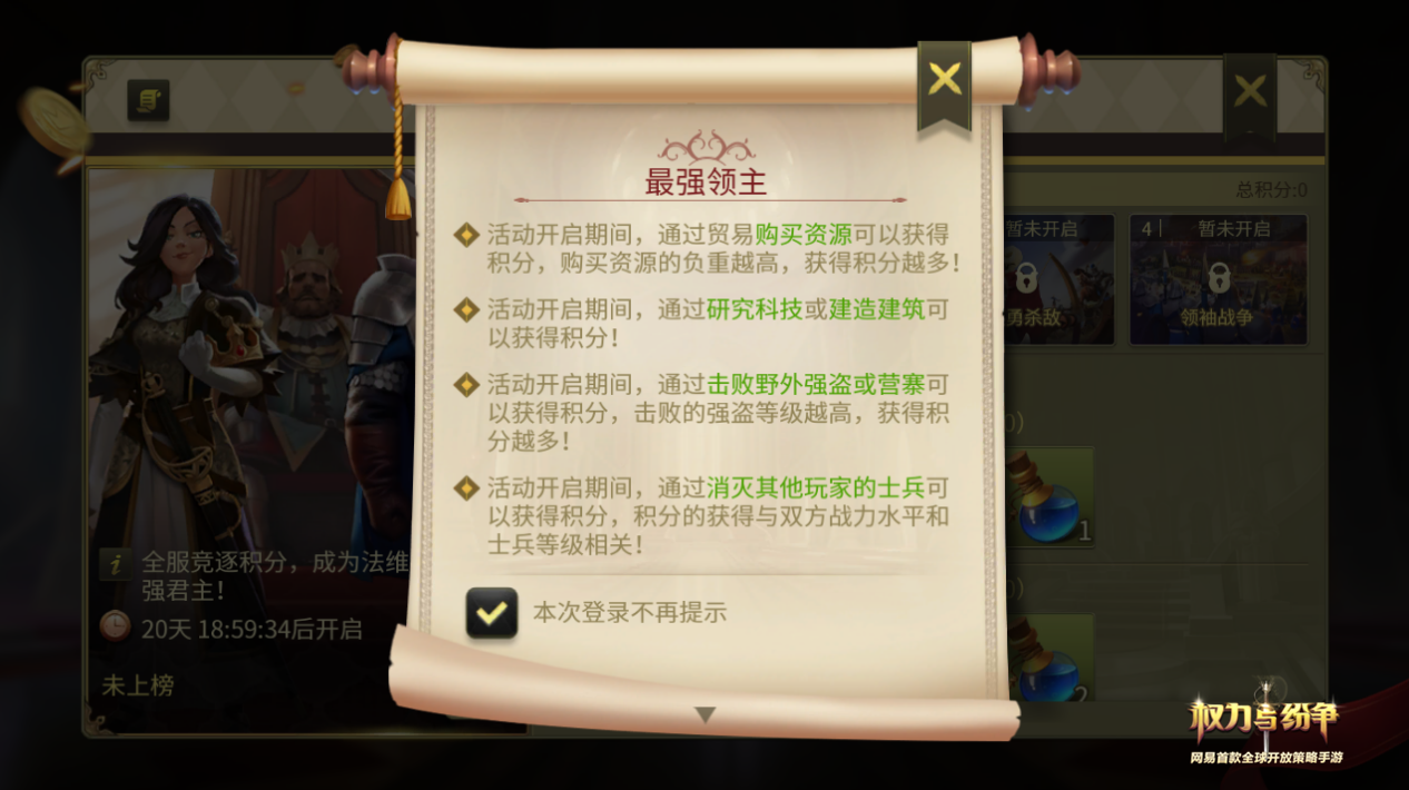 开启一场积分与时间的赛跑,加冕法维拉大陆最强领主,《权力与纷争》“最强领主”活动正式开启!在这场持续5天的比拼当中,领主们将依次接受“贸易大亨”、“荣耀之城”、“英勇杀敌”、“领袖战争”四大类挑战,找到不同的应对策略至关重要! 领主参与活动即可收获一定积分奖励,完成每个活动还可解锁不同阶段奖励。在每个挑战部分,你需要分别囤积充足的商队体力、行动力道具、通用加速道具,以及研究加速道具,同时,全面细致的前期准备和适宜的通关策略,也将帮助领主赢取更多积分!最终,总积分占据排行榜前列的领主,将有机会赢取 “传说信物礼盒”、“史诗侍从经验材料”等稀有游戏道具,领主战力也将得到进一步提升! 抢占先机 成为贸易大亨 对于所有立志成为最强领主的玩家来说,持续1天的“贸易大亨”部分挑战,会是他们抢占先机的绝好机会!在这个部分的挑战当中,领主们可以自由选择,通过贸易收购或是前往其他城镇的方式,花费银币购买资源,从而获得相应积分奖励。 购买资源总量越多,领主所得积分也将愈加丰厚。所以需要领主囤积足够多的商队体力以及行动力道具的同时,做好充足的准备!同时,建议领主在活动开启前几天,逐渐清空仓库,积攒大量银币(银币不够,可出售城墙和民居),以方便不断购入资源。 策略至上 建筑荣耀之城 良好的开端只是成功的第一步,领主们在第二阶段“荣耀之城”的挑战中,同样不能有所松懈!在第二阶段“荣耀之城”挑战当中,领主们还需要通过不断完成建筑的建造、提升建筑研究等级而获得丰厚积分奖励,其中建筑所需完成时长越久,积分也将愈加丰厚! 由于这部分挑战同样只有一天时间,适宜的建造策略,将帮助领主迅速获得大量积分!领主们可以通过囤积并使用大量通用加速道具和研究加速道具的方式,缩短实际建造和研究时间,同时,也可在“荣耀之城”开启前几天做好充分的准备:提前开启城堡建造,从而在活动开启之时,只需消耗极少量的加速卡,即可获得城堡建造时间对应的全部积分收益! 英勇出征 征服作乱强盗 顺利达成前两个阶段积分目标之后,领主们想要继续高歌猛进,第三部分“英勇杀敌”同样不可以掉以轻心!作为“最强领主”活动中首个战斗类玩法,领主们将在持续1天的“英勇杀敌”活动中,与平原上的强盗和强盗营寨展开数场激烈的对战,只有全歼敌军才能获得胜利,同时收获积分奖励! 进攻不同等级的野外强盗,所消耗的行动力也不同,建议领主们囤积足够多的行动力道具,从而能够不断向强盗集团发起冲击!在攻打过程中,巧妙的阵容搭配将起到立竿见影的效果!领主们可以选择携带乐天派侍从 ,搭配5个不同等级盾卫,以及180个弓箭手,在强盗等级选择上,则建议选择10级强盗。 主动出击 引领领袖战争 进行到这里,持续5天的“最强领主”活动将仅剩下最后2天时间,而这两天也是领主们冲击最终积分排名的最后机会! 主动出击的策略,将在“领袖战争”这场全服玩家共同参与的PVP遭遇战当中,为领主赢得更多积分奖励!同时,成功完成防守、协防任务,领主们同样将获得一定积分奖励。 精心设计的城防布局、足够多的人口数量,以及适时的协防策略,将帮助玩家成功抵御其他领主的入侵,同时充沛的行动力道具囤货,也将让领主拥有更多的出击机会,源源不断地获得丰厚的积分奖励! 成为最强领主 赢取丰厚奖励 “最强领主”活动开启期间,领主们每完成一类挑战,都将获得丰厚金克朗,以及 “神秘信物礼盒”等在内的丰厚阶段奖励。 活动结束后,四项挑战积分总和排名前200名的领主,还将赢得活动专属丰厚礼包。礼包当中将包含 “传说信物礼盒”、“史诗侍从经验材料”、“钻石经验药水”、“黄金经验药水”这些稀有的游戏道具。作为献给各位领主的最佳褒奖,这些道具也将助力领主全面提升战力! 加入竞争的行列,成为法维拉大陆上实力最强的王!想要竞逐最强领主,玩家除了需要在每个阶段全力以赴之外,在“领袖战争”部分更多地选择主动出击,也将收获更加丰厚的积分奖励!快来登陆官网下载游戏体验吧(官网:http://qlyfz.163.com/)!关于游戏的更多玩法、更多精彩内容,请关注相关后续报道。 【关于《权力与纷争》】 《权力与纷争》是网易首款全球开放策略手游。游戏共有五大类型、四十余种不同建筑,玩家可在自己的领地中,精确规划资源实现最大化利用,发展农业、工业、军事,提升城市实力,抵御外敌入侵。游戏内有金钱帝国、工业巨擘与战争之王三大派系,各大派系天赋不同,给予玩家更多个性化发展空间,不同派系玩家也可通过合作共同提升实力。游戏中有丰富完善的贸易系统,玩家可凭借自己的商业能力低买高卖,上演逆袭。游戏中更有联盟竞赛与战争,及后期将要开启的跨服战和跨国战等多种战斗玩法,玩家可与真人斗智斗勇,享受策略战斗的快感。 官方网站:http://qlyfz.163.com/ 官方微博:https://weibo.com/qlyfz 官方微信:qlyfz163 |