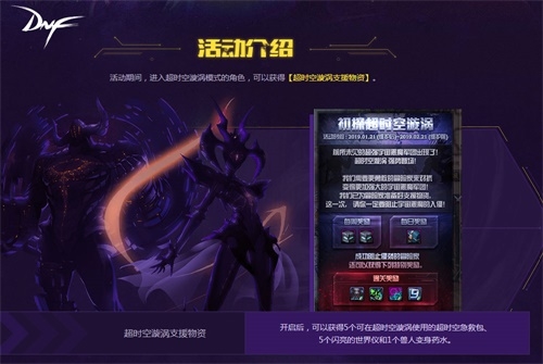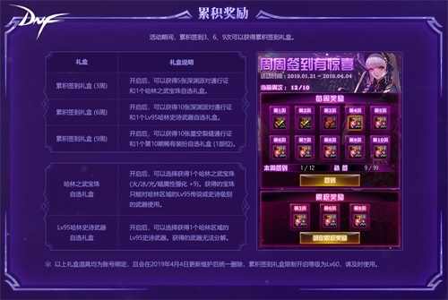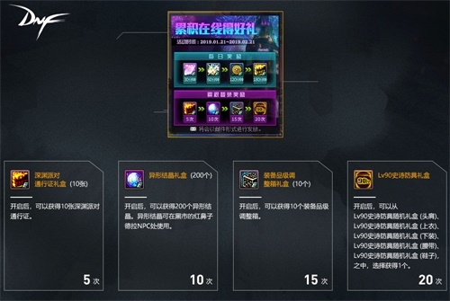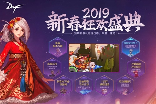 今日,万众瞩目的DNF全新版本“佧修谜影”正式上线。95满级扩张,全新哈林区域地下城,全新深渊及史诗装备,更有全职业平衡革新,冒险全线升级。除此以外,新春礼包正式上架,海量新春活动来袭。老玩家回归直升90,每周签到赢十期金色天空,福利连环送,惊喜享不停。 DNF2019新春版本链接: https://dnf.qq.com/cp/20190121index/?ADTAG=media.main.top.chapter&e_code=460489&idataid=246753 冲刺95级 全职业平衡改版 在全新版本中,勇士们的角色等级上限达到95级。新区域哈林有6个新的普通地下城,其中的深渊派对可以获得95级哈林史诗装备。而普雷的故乡——曾经美丽的星球泰波尔斯成为新的高难度地下城,和全新的深渊星空裂隙一样,都可以获得最强大的泰波尔斯史诗套装。通过超时空旋涡掉落的反物质粒子还可以升级泰波尔斯史诗防具! 同时20个职业进行平衡性改版,男圣骑和剑豪以全新的面貌与大家见面。男圣骑的武器祝福和天使祝福被删除,合并在荣誉祝福中,技能简化操作更为便捷。新被动技能“圣念”使得奶爸的体力和精神补正为两者中数值较高的一方,这使得奶爸无需再双修体、精两项数值,大大增强了自身的辅助能力。剑豪的多数技能从伤害、范围到技能形态都得到大幅增强,真正实现了貌美如花与战力爆表的统一。除了男圣骑与剑豪外,其他所有职业都得到了优化和平衡,新版本为玩家提供了更多元化的职业选择,也使得多个职业在新的地下城以及团本的表现更为抢眼。 世界树的传说 新地下城来袭 随着新春版本的上线,新地下城“世界树的传说”也是正式开启。1月21日到4月4日,赛丽亚房间会出现活动NPC,领取并完成活动任务便可进入活动区域。整个“世界树的传说”分为普通地下城、结局地下城、封印之地以及困难地下城四个章节。玩家可以根据剧情的推进,不断深入冒险并且获得丰厚奖励。不同的章节对玩家的等级有着不同的要求,完成后获得的奖励也各不相同。白金徽章礼盒、守护珠、LV95哈林区域传说武器、深渊派对门票、一觉新插图等悉数奉送。探寻远古的传说,开启未知的冒险,获得神秘的赠礼,“世界树的传说”等你挑战。 飞速升级冒险家征集令发布 1月21日至2月21日,DNF冒险家征集令发布,参与活动即可获得白金徽章、黄金增幅书、深渊派对通行证等奖励。2018年12月31日后再没有登录过DNF且拥有Lv60级以上角色的老玩家,可在活动期间成为回归勇士,享受七日登录飞速升级的福利,在线一定时间还可获得惊喜礼物。现役勇士邀请回归勇士,组队进入推荐地下城还会额外掉落羁绊硬币,可在赛丽亚房间NPC处兑换白金徽章、黄金增幅书等各色奖励。活动期间,现役勇士与回归勇士组队通关团队模式地下城,团队中所有玩家均可获得浓缩的魔能石、暗能量等额外奖励。 每周签到有惊喜 赢第十期金色天空 1月21日至4月4日,勇士们坚持签到,还可获得稀有装扮和Lv95哈林史诗武器。活动期间,玩家每周可获得一次签到机会,一周累计通关4次推荐地下城后即可在活动页面签到,并领取对应奖励。除此之外,额外通关40次推荐地下城补签2次。累积签到3、6、9次,可获得相应的深渊派对通行证、星空裂缝通行证以及累积签到礼盒。坚持签到,哈林之武宝珠自选礼盒、Lv95哈林史诗武器自选礼盒以及第十期稀有装扮自选礼盒(1部位)都可全部带走,奖励丰厚超乎想象。 每日登陆有好礼累积在线贺新春 2月4日至2月12日,DNF勇士喜迎新春,活动期间每日登录游戏即可领取礼盒。每日礼盒包含王者契约礼包、异形结晶礼袋、新春好运福袋、黎明裂缝通行证、泰波尔斯通行证等道具奖励。 1月21日至2月21日,勇士们每天站街30分钟、60分钟、120分钟、180分钟可获得闪亮的雷米援助礼盒、王者契约礼包、复活币礼盒、黎明裂缝通行证奖励。活动期间,勇士累积站街达成第四阶段(180分钟)5、10、15、25次可获得累积奖励,获得深渊派对通行证礼盒、异形结晶礼盒、装备品级调整箱礼盒、Lv90史诗防具礼盒。 红包high翻天 登陆领礼包 2月5日至2月19日,勇士们登录游戏即可领取大红包,获得深渊票、特别纪念称号、999心意点等奖励。活动期间,勇士们每天登录游戏即可在活动页面参与签到,签到累积次数达成1、2、3、4、5、6、7天即可领取对应的红包。累积签到7天,可领取感恩的心礼盒,正月初八后还可领取祝福阿拉德礼盒。本次活动可在DNF助手APP参与抽取QQ超级会员好礼,连续7天通过APP签到还可获得补签资格一次。 冲刺满级 冲击哈林 1月21日至2月21日,90级以上勇士可参与冲刺冲级活动,向哈林进发,达成满级任务要求。达成升级要求或通关断头谷等地下城10次,可分别获得对应的活动任务奖励。开启奖励礼盒,可获取巴吉尔迅捷药剂、哈林新手恢复药剂、迪欧尔贝之息药剂、蒙德格林之息药剂、妲可儿之息药剂、耶娒之息药剂、成长胶囊、异形碎片等道具。 新的冒险初探超时空漩涡 1月21日至2月21日,勇士们可进入超时空漩涡模式,一起阻止宇宙恶魔的入侵。进入超时空漩涡,可获得超时空漩涡支援物资,开启后,可获得5个可在超时空漩涡使用的超时空急救包、5个闪亮的世界仪和1个兽人变身药水。累积通关每周可领取一次初探超时空漩涡每周礼盒,累积通关2次、4次、6次、8次,也可获取机械魔兵变身药水礼盒、引力恶魔:薛丁恶变身药水礼盒、超时空战场印迹、宇宙恶魔伤害字体等对应的奖