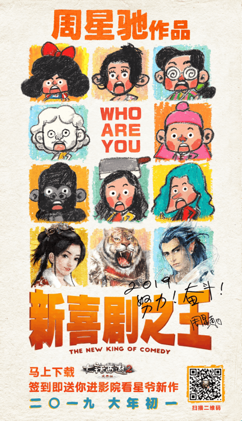 2019年1月1日零时零分,电影《新喜剧之王》的官方微博发布了一张特别的新年贺图:一个熟悉的背影拎着“兵器谱排名第一”的折凳站在《新喜剧之王》的海报前,跟海报上的“卡通公主”摆出同样的姿势,下面是一句手写的贺词:“2019,努力,奋斗!”落款不是别人,正是周星驰! 大话玩家专属福利 《新喜剧之王》陪你过大年初一 2019新年伊始,周星驰带着已经定档2019大年初一的电影《新喜剧之王》一口气为影迷送上拜年图、全新海报,首款预告片三重大礼!今天,大话2也将携手《新喜剧之王》为大家送上大礼,大年初一,免费送大家去看电影! 大话西游2与2019年新春贺岁电影《新喜剧之王》正式达成合作!游戏内将同步上线签到活动,每日在线五分钟即可签到赢《新喜剧之王》电影票,网易大神、微信公众号、论坛、CC、微博也将同步上线多重互动活动,邀请好友助力点亮联动海报同样有机会免费去看《新喜剧之王》!开启福气满满的金猪之年吧! 大话玩家亲临电影发布会 与“新喜剧之王”零距离接触 《新喜剧之王》将于大年初一全国上映,电影首映发布会近日即将开启;届时,大话主播玩家将亲临现场为大家全程直播,敬请锁定CC30/CC815与《新喜剧之王》零距离接触,一同见证下一个“新喜剧之王”的诞生! 正如联动海报之上的“who are you”(你是谁)所问,8个全新“喜剧之王”候选人和多个游戏角色,谁才是你呢?大年初一,一起锁定大话西游2和《新喜剧之王》,开启努力、奋斗的一年,让我们一同期待! 《大话西游2经典版》,国风经典,亿万口碑扛鼎之作!官网:http://xy2.163.com/ 《大话西游2免费版》,绿色免费,轻松赚钱,经典再临!官网:http://dh2.163.com/ 《大话西游2口袋版》,满分经典,指尖还原!官网:http://xy2.163.com/koudai/ |