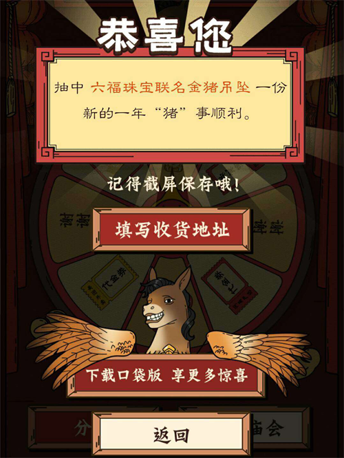 已经有小伙伴抽中金猪向二哥炫耀了,你还不快点来?即日起至1月24日,参与《大话西游2》线上金猪庙会H5,你也有机会带走大话金猪吊坠! 百万年货上线 丰厚奖励赢不停 金猪庙会热闹登场,线上H5玩法趣味十足,大话携手六福珠宝、网易严选、美团外卖、优酷视频四大品牌为大家送上丰厚年礼!六福珠宝定制金猪吊坠、严选美食礼盒、美团外卖代金券、优酷视频会员、精美人物周边抱枕……你喜欢的通通都送你! 即日起至1月24日,扫一扫二维码进入H5小游戏,何大雷、太白金星、大理寺官员,大家熟悉的三位NPC就在小游戏里等你,他们可是身怀各种奇珍异宝等着送给大家,挑战三大NPC的摊位就有机会获得我们送出的丰厚大礼哦!此外,下载口袋版完成特定任务,还能获得更多抽奖机会! 扫码逛庙会赢金猪 活动规则一览 口袋版机会多多 动动手指就有机会拿到年货大奖,那要怎样才能获得更多抽奖机会呢,小编来告诉你! (1)每个游戏账号每天可以逛大话年货庙会两次,每天00:00更新参与次数,隔天不累计; (2)每个摊位挑战成功可获得抽奖券一张,挑战一次最多获得三张摊位挑战抽奖券; (3)下载口袋版,完成指定任务可获得抽奖机会; (4)每个账号每天最多可获得6次抽奖机会。 除了每天固定的抽奖次数以外,在口袋版中完成任务还能获得额外的抽奖机会哦!角色等级≥30级、时间宠≥10级的玩家,即日起至2019年1月23日期间,只要其中有3天使用口袋版登录或者在此期间口袋版在线时长大于120分钟,即可在1月24日前往长安(234,141)找口袋版特使抽奖,有机会赢取大话金猪吊坠! (扫描二维码下载口袋版) 温馨提示:玩家抽奖前需验证游戏账号(经典版≥2转140级),获奖后填写收货信息,奖品将在活动结束后的30个工作日内寄送;金猪吊坠则需在3月初寄送给得奖玩家,敬请耐心等待。 连续8天,线上金猪庙会H5火热开启,海量豪礼送不停!祝各位小伙伴好运不停,几率常伴! 《大话西游2经典版》,国风经典,亿万口碑扛鼎之作!官网:http://xy2.163.com/ 《大话西游2免费版》,绿色免费,轻松赚钱,经典再临!官网:http://dh2.163.com/ 《大话西游2口袋版》,满分经典,指尖还原!官网:http://xy2.163.com/koudai/ |