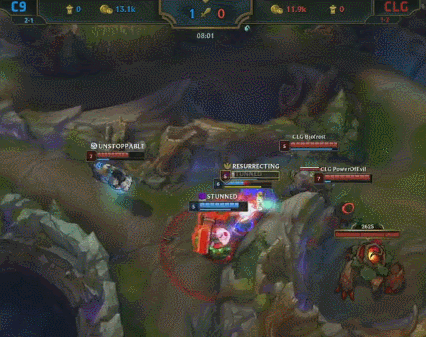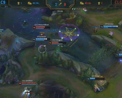 比赛8分钟C9在CLG红野区被拉扯打出一个0换4!