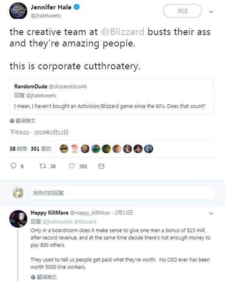 在推文中Hale表示:暴雪的创意团队勤奋又出色,而(动视暴雪)公司却是残忍而不择手段的。
