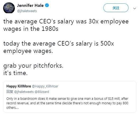根据外媒的报道,动视暴雪在2018财年的收入并未下降,反而是创下了“历史新高(record-setting)”。网友Happy Killmore就在推特上吐槽称:董事会的成员会因公司收入创新高获得1500万美元的奖金,但同时他们又做出决定:没钱给800个其他员工付工资了;人们常说每个人的工作有多少价值就能拿多少工资,但没有任何一个CEO的工作是值得上5000个流水线员工的工资的。 Jennifer Hale也在推特上回帖吐槽:上世纪80年代时CEO的平均工资是员工薪水的30倍,而如今CEO的平均工资则是员工的500倍。是时候拿起你们的干草叉了。