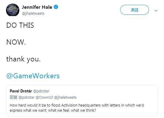 Jennifer Hale在今天也发布了多条推文,呼吁游戏开发者们起身反抗,她还请网友们贴出动视高管的收信地址,呼吁人们现在就向他们投出抗议信表达自己的意见。