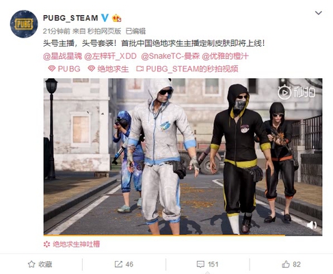 2月18日下午,《绝地求生》 官方微博 宣布首批中国绝地求生主播定制皮肤即将上线! 据了解,首批皮肤共有四款,分别对应了四位《绝地求生》游戏主播:星魂、XDD、曼森、橙汁。 从视频来看,四款皮肤都是连帽卫衣设计,二黑、一白、一蓝,一静一动都格外拉风。除了衣服外,武器上也有主播的专属标识。目前官方尚未公布开售时间及价格。 2月9日,全球最大的PC游戏平台Steam公布了2018年年度大奖的获奖名单,其中最重磅的年度最佳游戏大奖被《绝地求生》拿下! Steam年度大奖是由玩家投票选出,奖项共分为8个,分别是年度最佳游戏、年度最佳VR游戏、爱的付出、最佳开发者、最佳环境、独乐乐不如众乐乐、最佳架空历史与最佳机械游戏。