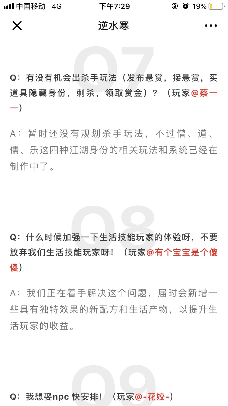 会呼吸的江湖《逆水寒》以真实和自由度而著称,游戏中休闲性玩家可以选择包括耕种、钓鱼、酿酒在内的九种生活技能。 虽然通过在生活技能的制造和采集环节中加入小游戏来增强了随机性与操作感,但很多玩家还是觉得趣味性有待加强,著名作家、逆水寒玩家天蚕土豆就曾经公开表达过对生活技能的不满,认为还有很大的优化空间。 在上周的《逆水寒》策划沟通答疑中,也有玩家提到了生活技能,这次有了很好的消息。 《逆水寒》最大的优势是出色的画面,和逼真的细节设定,目前生活技能虽然存在感不强,但是制造过程充满随机与趣味,如果安排一波提升性的改动,相信能带来焕然一新的体验。 了解更多相关信息,请前往http://www.yzz.cn/game/nsh/ |
