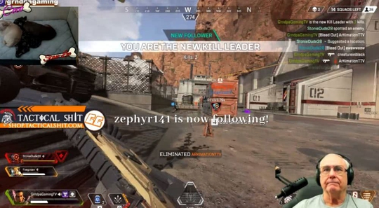绝大多数《APEX》玩家都不会知道,他们的对手可能是一名66岁高龄的退伍老兵。 GrndPaGaming在直播平台Twitch上有15万粉丝。 就像大多数专职主播一样,他紧跟潮流,直播当下最热门游戏:曾经是《战地》,是《绝地求生》,现在是《APEX》。他像很多射击游戏玩家一样,在对手倒下后上前说出一些嘲讽性的垃圾话,在被杀死时愤怒地大叫。唯一让GrndPaGaming与众不同的是,他是一位已经66岁高龄的退伍老兵。