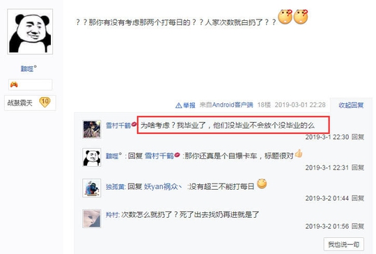 就算他们两个死了之后再返回城镇出去,保留住了次数,也浪费了不少时间和精力。对于网友们的愤怒,这位玩家却表示“我为什么要考虑别人的感受,我毕业了,他们没毕业就不会放个没毕业的奶妈吗?”,看来这位玩家纯属故意报复社会,而且就没有打算让别人对自己有任何好感。 |