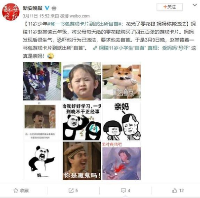近日,据新安晚报微博报道,有位11岁男孩背着一书包的游戏卡片到警局自首,因为妈妈吓唬他购买游戏卡是犯法行为,于是大晚上背着书包去派出所“自首”。