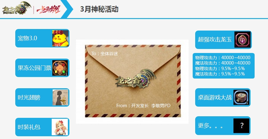 《龙之谷》新主城红莲宫即将在4月末震撼开启,从近期陆续爆出的猛料来看,红莲宫无疑是一个隐藏着重重危机之地。继“红莲·序”之后,下周四,《龙之谷》将开启“红莲祭”庆典,超嗨的红莲宫预热活动,相信会给谷迷们带来满满的福利和惊喜,更好的为进入新主城提前做准备。在上个版本中入驻的巴克斯x巴克斯x巴克斯,在下周版本更新后,将变更为老谷迷们印象特别深刻的天启BOSS,桌面游戏大战也将再次回归。多倍的福利,多倍的快乐! 抢先围观红莲宫完整开场视频>>> 天启回归?时空旋风开启“魂”模式 在2月更新的《龙之谷》“红莲·序”版本中,巴克斯x巴克斯x巴克斯为谷迷们带来了不一样的体验。从输出方式、合作方式等多方面,与以往的时空旋风打法大不相同。下周四,曾经令无数谷迷痴(beng)迷(kui)的天启巢穴的终极大BOSS返场,占领时空旋风成为霸主。而这次,谷迷在战斗过程中,可以食用“魂”来成为多种NPC,萨德尼斯、艾奥纳、卢比纳特、阿尔杰特、杰兰特、贝思柯德……在同一场战斗中,有机会变身成不同的NPC,并施展各类NPC技能。哪一个,会成为你的最爱呢? 桌面游戏大战回归!神秘信件活动送上多类好礼 从2月末版本更新后,《龙之谷》便上线了全民送特武活动。所有账号均可通过完成【全民特武任务箱】,来获得金龙/银龙的鳞片,如果在4月1日前,拥有特定鳞片,即可在活动结束后获赠蔷薇蝶舞主副手武器。而为了让更多谷迷都能在新主城红莲宫开放之前,做好充分的准备,《龙之谷》下周四更新后,更是将开启春季最强福利的神秘信件活动,无论是装备还是时装,无论是龙玉强化还是成长型A级宠物,全部都免费送送送!游戏内还将有桌面游戏大战玩法回归,奖励也有提升哦! 《龙之谷》3月21日下周四,超强福利庆典“红莲祭”即将开启,时空旋风天启“魂”式玩法引爆NPC混战,桌面游戏大战回归,神秘信件活动好礼爆棚。红莲之战,一点即燃! 《龙之谷》“红莲·序”版本更新! 新主城红莲宫!预热活动福利爆棚! 蝶舞特殊武器!属性提升免费放送! 超强幻境精灵!逆天属性中看中用! 脉冲套装上新!锦绣新装大国之风! 签到每天领奖!冒险之路更加轻松! 《龙之谷》客户端下载地址: http://dn.sdo.com/web10/down/game.asp 开启撩GM的新方式!扫一扫关注龙之谷全新微信订阅号,有奖活动一手信息全部轻松GET: 参与互动及讨论,请关注龙之谷官方微博: http://weibo.com/doublekill 了解玩家同人文化,请关注龙之谷官方同人小站微博: 微博:http://weibo.com/u/5995646551 了解更多相关信息,请前往http://dn.yzz.cn/ |