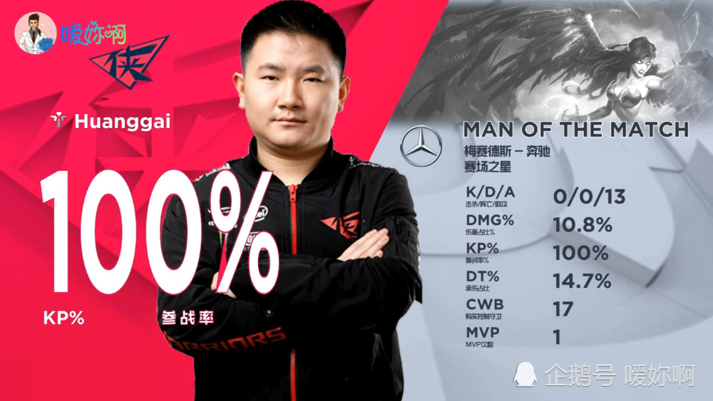 在昨天的比赛中这位黄盖选手表现也是非常亮眼,RNG四个人包下越塔想强杀一个辅助,没想到他真的是黄盖啊!剩一丝血没有死,而在后期的大龙团中,更是一个人抗住了RNG三个输出位的伤害,为队友拖延了时间,然后帮助RW赢得团战,在第一场比赛结束后,这位黄盖选手也是以0—0—13的华丽数据,还有百分之百的参团率荣获MVP。