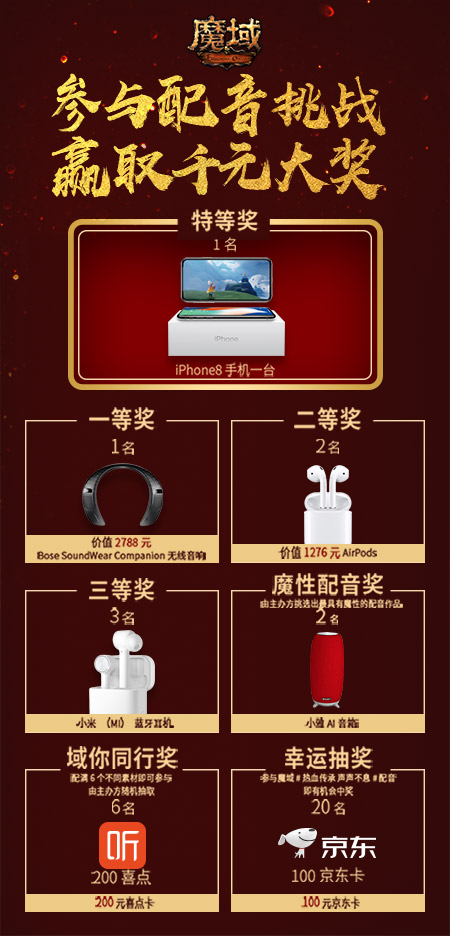 随着原创声音魅力竞演秀《声临其境》火热播出,越来越多人感受到了“声音”的独特魅力。您是否也很想像实力声咖那样,能有一个尽情展示自己的舞台?现在,机会来了!《魔域》品牌月,与喜马拉雅强强联手举办“热血传承,声声不息”配音挑战赛,跌宕起伏的热血剧情等您重新演绎,更有机会免费赢取iPhone 8、Bose SoundWear Companion无线音箱、AirPods等土豪大奖 ! 知名配音大师助阵 热血魔域“声”临其境 “来吧!我们并肩而战,魔域的奇迹,由您谱写!” “没有什么事是魔域解决不了的,大不了pk的时候我任你打。” “多亏勇士及时赶到,谢谢你!小女子无以回报,我愿…以身相许!” 热血向的兄弟情义让人听得热血沸腾心潮澎湃,爱情向里的缠绵悱恻,感人至深,正是情比金坚的最好诠释。 有了经典的《魔域》剧情,当然也少不了著名配音大师的倾情献声。在这次的配音挑战赛中,《魔域》邀请了知名配音大师吴磊、陶典、赵乾景录制参赛视频素材。当配音届男神音女神音遇上魔域热血台词,直接带您“声”临雷鸣大陆,万人团战的热血现场。 献“声”魔域 iPhone 8等千元大奖送不停 一直以来,《魔域》用恢弘的CG、爽快的游戏玩法来诠释着游戏的热血,但在这次品牌月活动中,将尝试用声音来演绎热血团战兄弟情深。热血传承,声声不息,用自己的声音,为热爱献“声”魔域 ! 配音挑战赛的参与方式相当简单,3月15日至3月29日活动期间,通过喜马拉雅APP或是关注魔域公众号(魔域小甜心)进入活动页面,从6个视频素材选择1个为其配音,并选择魔域#热血传承 声声不息#话题发布配音视频即可。 当然,如果您想要把iPhone 8、Bose SoundWear Companion无线音箱、AirPods等壕气大奖抱回家,那就要好好把握。点赞数是评选的唯一标准哦!期待您的精彩表演。 一如既往不忘初心,三生有幸热血前行!我们曾经用热血征服高空,我们曾经用热血征服大漠,这一次我们将带您感受不一样的《魔域》声音世界!是兄弟,重燃您的热血;是伴侣,庆幸余生有您! |