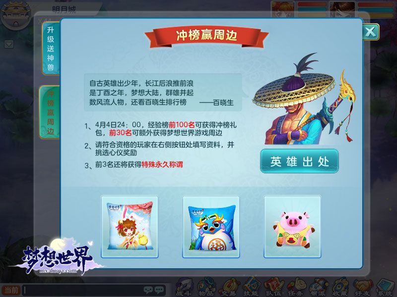 全新《梦想世界》新内容“江湖秘宝”明日开启,全新系统江湖秘宝录上线,完任务赢取丰厚奖励,还有机会获得小青龙达贡!三大活动齐上阵,精彩玩法不停歇,主题新服同步开启,升级冲榜赢神兽!还有新角色,新小精灵、灵兽觉醒等更多精彩内容等待着大家。 全新系统来临 江湖秘宝录开启 全新《梦想世界》新内容“江湖秘宝”开启之际,神秘新系统终于揭开了他的面纱,江湖密宝录全新亮相,这个记载着梦想大陆众多宝物来源的神秘图册来到大家眼前,《梦想世界》又一次成为了别人家的游戏! 秘宝录,重点就在一个宝字上,按图索骥就能获得各种宝物是它的核心特点。江湖秘宝录会记录玩家的探索值,各位玩家在提升等级、完成日常任务、每周挑战时,可以获得探索值,提升探索值等级就可以领取对应的奖励! 三大活动齐上阵 精彩活动玩不停 全新《梦想世界》三大活动开启,角色扮演双人国宝,双人组队体验不一样的任务玩法。玩家可以自由选择扮演官兵还是盗贼,贼兵之间需要对抗相互抢夺国宝才能完成自己的任务,这是一个需要策略作战的双人多抗游戏。 夭夭桃李花,灼灼有其华!梦想天香秀年度选美活动开始,这里又梦想大陆的最美的小仙女,也有梦想大陆最潇洒的小迷弟!这可不仅仅是一场选美活动,每个进入复赛的选手还将在游戏中建立自己的博客,与她的的粉丝进行互动,传说中的女神终于走到了你的眼前!夺冠的女侠还将获得专属称谓、香奈儿可可小姐香水摩登限量礼盒等豪礼! 除了双人国宝、梦想天香秀,还有全新天魔殿即将登场。天魔破除了天界多年的封印,重新降临在梦想大陆,召集大量魔将在天魔殿,各位少侠赶快顺应使命的召唤,一起来守卫梦想大陆! 升级送神兽 冲榜赢周边 全新《梦想世界》主题新服“物华天宝”今日开启,在3月22日-4月4日新服开启两周内,在线满60小时且等级超过50级的玩家,均可获得冲级礼包,并将在这些玩家中随机抽取3名玩家赠送随机神兽。 在活动结束时,经验榜前3名玩家将额外获得永久特殊称谓;经验榜前30名玩家能够领取《梦想世界》游戏周边,可在点点抱枕、小飞猪公仔、梦想企鹅抱枕中任选一种;前100名的玩家都能够获得礼包奖励。 本次全新内容即将开启,相信会给各位玩家带来全新的体验,3月22日,全新系统,全新玩法等精彩内容等待着大家! 关于新《梦想世界》 全新《梦想世界》,国风武侠回合战斗网游,十一年经典回合IP,以主修辅修双流派的强大招式体系,继承见招拆招、相生相克的策略战斗特色;同时打造深度游戏世界观,全新美术升级,明月如初,国风新起,这一次,江湖等你缔结侠缘! |
