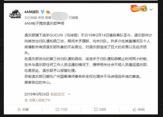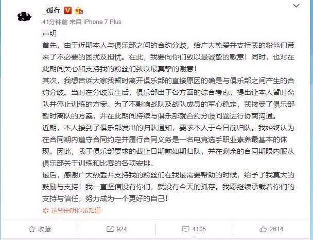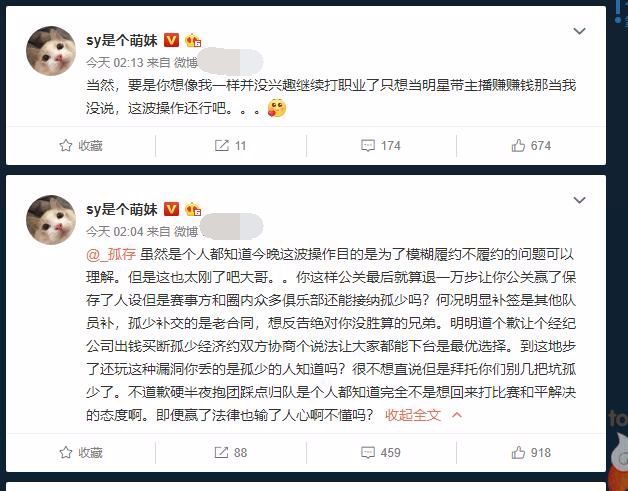 近日,年度电竞撕逼大戏——4am战队和孤存双方的战斗仍旧在继续。3月24日晚,孤存在没有同战队教练龙神绝沟通的情况下,一行四人进入了4am的训练基地,同时自己还在微博上放出了这样一条微博。 然而龙神绝却并不认同孤存的说法,在孤存进入基地之后,龙神绝表示让孤存到杭州报到,不是到线下基地报到。在同行的三个人不愿意标明身份,而且孤存不愿意离开基地的情况下,龙神绝果断选择了报警。在双方交涉的过程当中,孤存反复问龙神绝“你是不是要赶我走”,带节奏的意图可以说是非常明显了。 不过由于有了之前录音事件的教训,这一次龙神绝并没有上当,而后孤存便发出了另一条声明。 作为孤存进入4am的介绍人,知名主播sy是个萌妹对于这件事情也发表了自己的看法。他表示,孤存目前的处境和他幕后的公关团队有着很大的关系。事情已经闹到这个地步,几乎就已经没有和平解决的可能了。通过法律途径来解决双方的纠纷,或许是唯一的出路。 如果说之前4am方面还想和孤存坐下来好好商量和平解决的话,经过了这一次的折腾之后,4am方面也终于决定不再仁慈了。针对孤存发出的声明,4am战队在其微博上也发布了针对此事件的声明。将这件事情全权委托给了律师事务所来进行处理,双方下一次的交锋,恐怕要等到在法庭上见了。 用一手好牌打的稀烂来形容孤存是再合适不过了。官司打赢了还好说,一旦官司打输了,孤存面临的可能是彻底告别电竞圈的窘境。那么问题来了,大家对于孤存的这波操作有什么想法呢?欢迎大家在下方的评论区说出你的想法哦! |