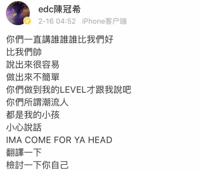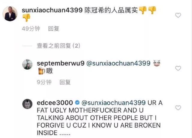 最近,熟悉带带大师兄的人都知道,继蔡徐坤之后,他又惹上了一位明星,而这位明星就是很少在公众面前露面的陈冠希。 事情的起因是有一个名叫“sunxiaochuan4399”的用户,在陈冠希的twitter下面回复:陈冠希的人品属实不行。而恰恰这个回复被陈冠希本人看到了,于是他直接在这个回复下开骂。 但是他可能不知道这个人并不是真正的带带大师兄,还拿了一张带带大师兄的照片来反击他,而这个假冒的粉丝也是毫不留情,直接回复:至少比你好,而且我还有一百多万的粉丝 。 这一下算是彻底激怒了陈冠希,于是他直接在在微博上发布了一条消息: 事情在网络上掀起巨大的双方粉丝互怼战,背锅侠带带大师兄只能自己亲自出面回复: 带带大师兄的回复情商很高,又风趣幽默,且不失礼仪,不愧是拥有100多万死忠粉的红人。 但陈冠希并没有对带带本人道歉微博进行回复,也不知道他看到还没看到。陈冠希是带带多年的偶像,带带应该对此事会非常在意,如果双方不能冰释前嫌,以带带儒雅的性格,绝对会挑选一些公开的场合向陈冠希进行郑重说明。带带已经不再直播了,但他仍然活跃在赛事活动,比如网易电竞NeXT,上一届被捕捉到他出席现场的身影。 其实,孙笑川与陈冠希这次的冲突,其实这也不是带带的狗粉丝第一次惹的祸,这种“孙笑川现象”恰恰是现今网络亚文化盛行的结果。孙笑川的粉丝自称 “嗨粉”,热衷于他们造梗。基于孙笑川的直播内容,不断把他与社会上的真实事件相连,各种移花接木。另一帮“狗粉丝”则是“嗨粉”的升级版,在各种热门之间中找机会让孙笑川牵连进去,通常都是负面关联。例如这次冒充孙笑川去谩骂陈冠希。 这种边缘性的网络文化,网民大肆发泄自己的情绪,将这种悲欢喜乐尽情的冲激着网络。我们身处这个网络时代,我们接受网络文化的洗礼,互联网络在一定意义上已经成了大部分人生活的第二空间,在网络中寻找快乐、刺激还有一部分人已经把网络世界当成了依托,这成为互联网发展势不可挡的趋势,每个人都应该寻找其中积极正向的意义去指引自己的生活,一向儒雅渊博的孙笑川相信会在NeXT春季赛上身体力行。 |