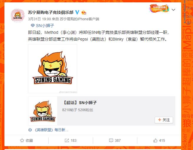 与奋战至最后一刻才悲壮出局的BLG战队不同,6胜9负的SN战队已经提前结束了春季赛的争夺。在LPL春季赛开始之前,谁都没有想到引进了闪电狼中辅加上实力ADC司马老贼的SN,竟然会无缘LPL的季后赛。队员磨合不佳状态低迷、教练BP存在问题、以及场外的节奏等等,都是造成SN战绩糟糕的原因。 #图片来源于英雄联盟赛事官网 对于这赛季SN的表现,连自己家的粉丝都看不下去了。在无缘季后赛之后,SN俱乐部官方微博发声表示辜负了各位粉丝和赞助商的支持,向大家表示了歉意,并称夏季赛一定会找回初心。然而面对战队的道歉,自己家的粉丝却并不买账。在这条道歉微博的下面,是一片指责之声。 #图片来源于SN战队微博 令人没有想到的是,在道歉微博发布三个小时之后,SN战队就官宣了队伍的人员变动。很多人都会想到SN一定会有人员离队,不过大家都没想到首先离队的不是教练,不是队员,而是战队的LOL分部经理。对于这个处理决定,粉丝们表示了支持,然而大家还是认为教练组才是最应该背锅的人。 #图片来源于SN战队微博 不过小编倒是觉得,联想起过去SN种种的管理层矛盾传闻,选择在这样一个敏感的时间节点上炒掉经理来作为替罪羊,也就不足为奇了。即使战队经理被炒,教练组也依然存在着离队的可能。 #图片来源于SN战队微博 虽然说目前SN这套纸面实力还算不错的阵容没有发生变动,但是在经过了一个失败的春季赛之后,很难说SN战队接下来能够以现有阵容继续征战夏季赛了。LOL分部经理的离队,或许只是战队内部人员大调整的一个开始。 #图片来源于英雄联盟赛事官网 那么问题来了,各位召唤师觉得SN战队这赛季的糟糕战绩应该让谁来背锅呢?欢迎大家在下方的评论区说出你的想法哦! |