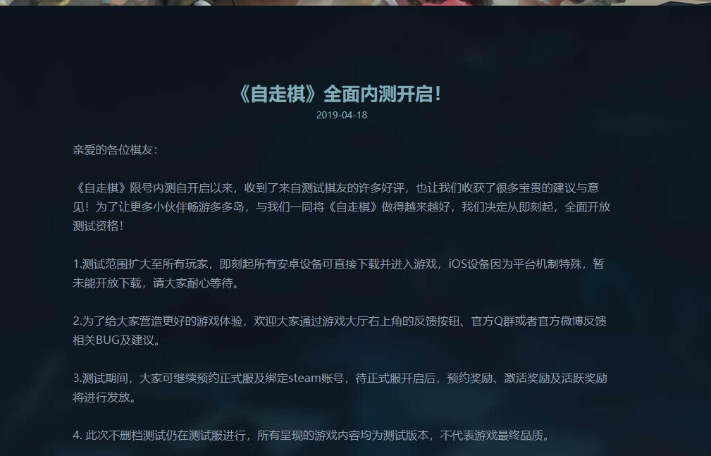 在3月底的时候,自走棋手游官方曾经自信满满的表示,自走棋手游的首个版本开发已经接近尾声,将会以限号内测的方式进行测试。然而到自走棋上线开启测试之后,玩家们苦苦等待的IOS端依然不见踪影,只有IOS端能够下载。而官网的预约活动,进度似乎已经停滞不前了。 令所有玩家没有想到的是,从内测开始到4月18日,自走棋手游官方仅仅只用了几天的时间,就推翻了饥饿营销的策略,由限号测试改为了不限号测试。很多玩家都非常疑惑,这到底是什么操作? 自走棋手游官方看似令人吃惊的操作,实际上有着其必然性。自走棋的玩家基础,是以PC端dota2的玩家为主的群体,而这部分玩家对于手游的热情究竟有多高,在自走棋手游开始测试之前谁都不知道。不过从目前的玩家反馈来看,负面的声音是大于正面的声音的。 层出不穷的BUG,迟迟不开的IOS端,加上画风的不讨喜,已经让自走棋遭到了不少的批评。如果再以限号的方式来打击玩家的热情,或许自走棋手游已经无法避免凉凉的命运。在这样的大背景下,通过开放测试让更多玩家进入游戏来拉动人气,或许是能够拯救自走棋手游的唯一途径了。 上述被提及的问题,实际上还有有解决方案的。但是自走棋手游在玩法上完全继承了端游dota2自走棋的模式,导致其对战时长依旧是非常的漫长。想要实现吃鸡,起码也要将近30分钟以上。这样的时长对于时间碎片化的手游玩家们来说,是非常不友好的。如果自走棋手游无法缩短游戏时长,那么未来一旦热度消退,玩家的流失或许是不可避免的。 那么问题来了,各位看官老爷们觉得自走棋手游的这波不限号操作,究竟是什么原因造成的呢?欢迎大家在下方的评论区说出你的想法哦! |
