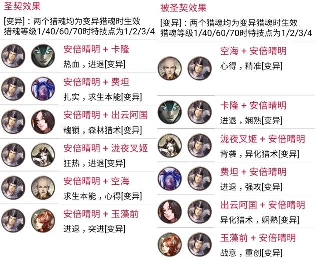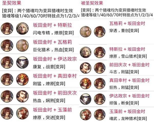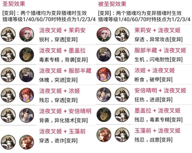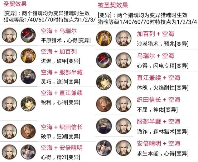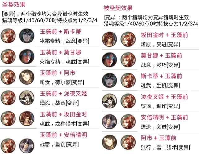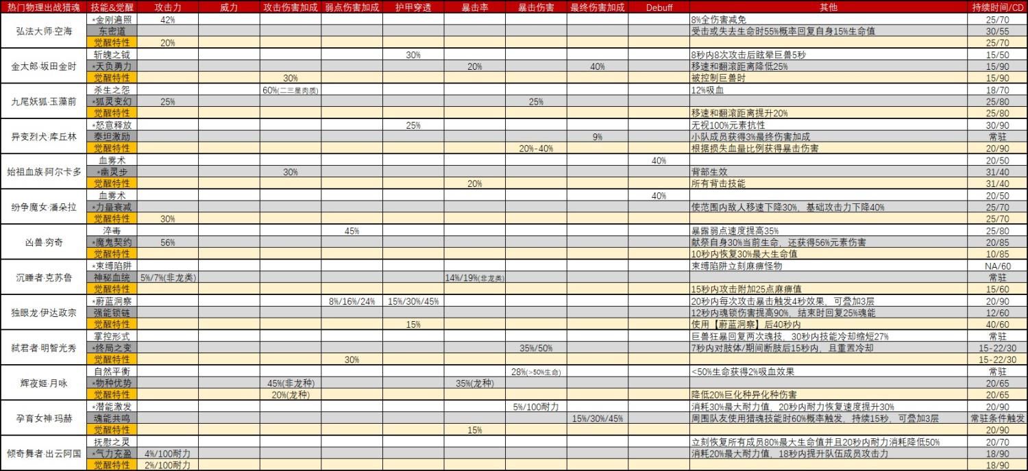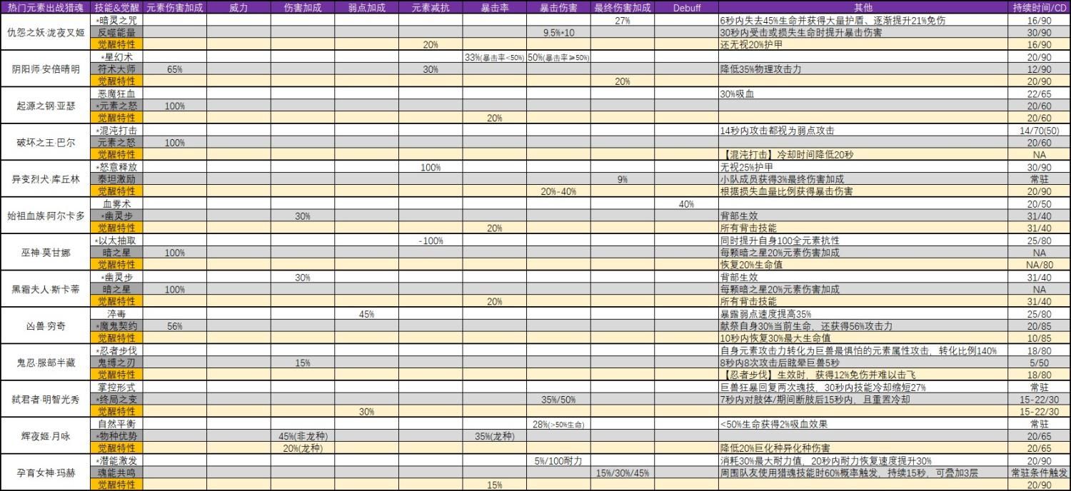 网易《猎魂觉醒》与《讨鬼传极》联动以来,讨鬼传的新御魂,给游戏注入了强大的激情与活力。猎魂作为游戏的核心内容。时隔近三个月,联动最终章御魂终于到来。那么,让我们来看一看联动最后五大猎魂在出战和配装方面能给我们带来什么样的惊喜。 本次第三弹新猎魂为弘法大师·空海(圣光系)、金太郎·坂田金时(泰坦系)、仇怨之妖·泷夜叉姬(黑暗系)、阴阳师·安倍晴明(秘术系)和九尾妖狐·玉藻前(自然系)。出战方面,与第一弹和第二弹猎魂相比,第三弹猎魂出战技能设定得较为强大,值得拥有;配装方面,第三弹猎魂引入了心得、燎原和进退三个富有特色的新特技,同时也丰富了猎魂圣契系统。 1. 出战分析 弘法大师·空海继承了圣光系的攻防兼备的传统,是一个攻比防更胜一筹的物理出战猎魂。 【金刚遍照】带来最高达42%的攻击力提升和8%的全伤害减免;【东密道】带来几率恢复自身15%生命值的治疗效果;五星觉醒特性是使用【金刚遍照】时攻击力额外增加20%,这样一共增加了62%的攻击力,非常强大。两个技能的CD情况也很好,分别为25/70和30/55的技能覆盖率。 金太郎·坂田金时彰显了泰坦系的狂暴的特性,是一个集眩晕控制、护甲穿透、暴击率、攻击伤害和最终伤害加成于一体的战争机器,因为护甲穿透特性,显然更适合物理出战。 【斩魄之钺】类似第一弹服部半藏的鬼缚之刃,使用后一定时间内攻击一定次数可以控制住巨兽,同时带来30%护甲穿透的效果;【东密道】则通过损失25%的移动速度和翻滚距离,带来最高达20%的暴击率和40%的最终伤害加成,非常强悍;五星觉醒特性更是对被控制的巨兽额外增加攻击伤害30%。技能覆盖情况复合泰坦系一贯的特点,分别为15/50和15/90,技能覆盖率较低。 仇怨之妖·泷夜叉姬依旧遵循了黑暗系元素向的风格,并且损失生命值的效果非常适合狂热特技。 【暗灵之咒】提供了带有大量护盾和免伤的自损血效果,比穷奇更加安全,并且还带来了多达27%的最终伤害加成;【反噬能量】则提供了可叠加10次的暴击伤害增加,最多提供高达95%的暴击伤害。五星觉醒特性无视20%护甲和抗性,进一步增加了伤害能力。整体再配合狂热特技,会同时获得较高的攻击伤害加成、暴击伤害和最终伤害加成效果。技能覆盖情况为16/90和30/90,覆盖率也较低。 阴阳师·安倍晴明出乎意料的强大,一扫秘术系往日“奇技淫巧之风”,是本次最强元素出战魂。 【星幻术】双重功效,暴击低于50%时能够获得高达33%的暴击率,暴击高于50%时又能获得高达50%的暴击伤害;【符术大师】最多增加65%的元素伤害以及无视30%的元素抗性,代价是降低自身35%的物理攻击力。五星觉醒特性是20%最终伤害加成。技能覆盖情况为20/90和12/90,覆盖率一般。 【九尾妖狐·玉藻前】保留了自然系独特的深藏不露厚积薄发的特性,和出云一样依旧是物理出战魂。 【杀生之怨】的设定非常具有特色,会对二、三星肉质提高大量伤害,并且能够伤害自身附近的队友,作为目前唯一能够伤害队友的出战魂,玩家们使用时可要小心檫枪走火哦;【狐灵变换】在40秒内通过翻滚来生效攻击力和暴击伤害,效果每次持续5秒,最多生效5次,注意效果不可叠加。五星觉醒特性是移动速度和翻滚距离提升,属于功能性特性。技能覆盖情况为18/70和25/80,覆盖率较高。 与以往强势热门出战猎魂对比: 【物理】 物理出战百花齐放,四强为出云阿国、潘朵拉、穷奇和坂田金时,明智光秀适合能够连续破肢体的情况,吸血鬼和克苏鲁通用性很好并且兼顾功能性(隐身/控制),库丘林加成团队作战,月咏玛赫常驻特技稳定生效适合鏖战局。 【元素】 元素出战异彩纷呈,爆发型为穷奇、亚瑟、巴尔,穷奇爆发最强,亚瑟持续稍好总伤较高,巴尔混沌打击强制弱点伤害,持续型为黑霜夫人、莫甘娜、库丘林、安培晴明、月咏和玛赫,其中黑霜夫人最为实用,莫甘娜和库丘林、安培晴明分别适合低元素星等和高元素星等的情况,安倍晴明适合暴击率低于50%且高爆伤的情况,月咏和玛赫同物理的结论。值得一提的是服部半藏,非常适合竞速双boss抗性不同场景。 2.配装分析 【新猎魂与新特技】 金太郎·坂田金是最大的亮点,燎原热血双伤害加成特技,非常给力。 弘法大师·空海是当前唯一心得特技镶嵌猎魂,变异特技为破甲进一步弥补了破甲难得的难题。 仇怨之妖·泷夜叉姬是穿透背袭镶嵌猎魂,适用于喜爱背袭的物理武器玩家。 阴阳师·安倍晴明是当前唯一进退特技镶嵌猎魂,变异特技求生本能适合与虹龙套和蛇影兽套配合使用。 九尾妖狐·玉藻前是第二个魂武镶嵌猎魂,对于不需要断食且有意战意的玩家可以尝试。 新特技心得、燎原和进退的效果: 【圣契与被圣契效果】 弘法大师·空海 点评:空海的圣契和被圣契主要是围绕心得特技设计的,选择心得的玩家要仔细看看。 金太郎·坂田金时 点评:坂田金时的圣契通常选择瓦格莉、前田庆次、玉藻前或真田幸村的组合;被圣契中与玉藻前和真田幸村的组合会比较常用。 仇怨之妖·泷夜叉姬 点评:泷夜叉姬的圣契最值得关注的是与浓姬的组合,残忍穿透非常适合物理玩家,同时可与玉藻前或茉莉安圣契搭配。被圣契中除了与服部半藏、茉莉安的组合外,都很适合输出型玩家的选择。 阴阳师·安倍晴明 点评:安倍晴明是进退镶嵌猎魂,因此圣契适合选择与卡隆、泷夜叉姬和玉藻前的组