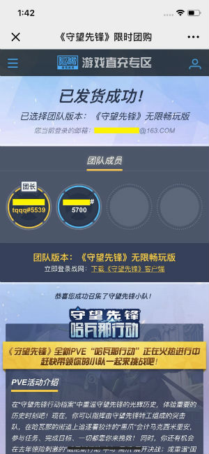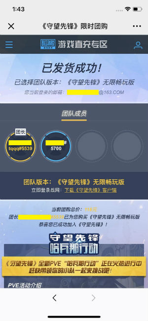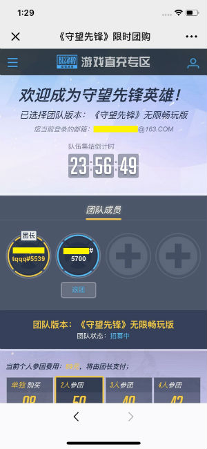 头图 《守望先锋》是由暴雪出品,风靡全球的第一人称团队射击游戏。通过团队之间的配合,合理的技能组合使手中的角色发挥最大的作用,获得最终的胜利。 为了让每个新加入《守望先锋》玩家都能够得到较好的游戏体验,4月26日-5月7日《守望先锋》开启限时团购特惠,鼓励新玩家邀请好友一同组团战斗,体验抱团上分的乐趣。 团购活动方式简单,2-4人即可成团,人多惠越多! 原价198的无限畅玩包团购价低至42元,原价328的典藏版团购最低仅需102元。 开团后,团长可邀请好友入团,并用优惠的价格为所有团员一同购买客户端,开团支付成功后团长还可额外获得5箱标准补给。 团购活动期间,《守望先锋》还将同步开启免费试玩,玩家将可以免费畅玩《守望先锋》全部30位英雄、27张地图以及除“竞技比赛”外的多个游戏模式,包括快速比赛、自定比赛、死斗模式,以及最新的PVE模式“哈瓦那行动”。 手把手教你快速成为团长: 一:手机扫码进入团购页面 二:为团队选择游戏版本 三:点击“我要开团”,在队伍集结倒计时结束前邀请好友入团 四:确认组团完毕,进入支付页面完成支付 五: 在付款倒计时结束前选择支付方式,并完成付款 六:恭喜您与好友一同成为守望者! 如何加入团购,成为团员: 一:点击团长邀请链接进入团购页面,查看当前团队状态 二:点击“我要加入团购”,加入团购序列 三:等待团长支付团购费用,支付完毕后立刻获得《守望先锋》客户端 四:恭喜您与好友一同成为守望者! 注:建议您截图保存团购活动二维码,当您关闭团购页面后,可以通过扫描二维码进入团购页面随时查看团队状态; 您也可以通过官网活动页面链接(https://event.blizzard.cn/minisite/ow-group)直接进入团购页面查看您的团队状态,或在暴雪游戏直充专区点击“我的订单”来进行查看。 活动规则 1. 本次限时团购持续时间为4月26日10:00:00-5月7日23:59:59,未激活《守望先锋》客户端的战网注册用户均可参加团购; 2. 手机扫描活动页面二维码进入团购页面,申请开团后可通过专属链接邀请好友参团,成团人数2-4人之间可任意选择,参团人数越多,优惠幅度越大; 3. 参团用户点击团长邀请链接,登录战网账号后即可加入限时团购,随时查看团购成员,且团购费用全部由团长支付; 4. 开团后组团时间为24小时,其间团长可随时邀请或移除团员,直到团长确定组团完毕。请注意:如果开团时间距离活动结束时间不足24小时,组团倒计时将以活动结束时间为准,例如5月7日10:00:00开团后组团倒计时时间为13:59:59; 5. 团长确认组团后需在15分钟内进行支付,逾期未完成支付或24小时内未能确定组团,则团队自动解散,不扣除任何费用; 6. 团长完成支付后所有团员均可立即激活《守望先锋》客户端,团长还可额外获得5个《守望先锋》标准补给奖励与暴雪游戏积分,积分即时到账,补给将在5个工作日内发送到团长账号内。 7.请自行确认参团的战网账号是否有误,一旦支付成功,将无法申请退款; FAQ Q:如何参加本次限时团购? A:手机扫描团购页面二维码直接进入团购页面,点击登录开团;或通过其他玩家的组团邀请链接进入,登录组团后即可参加限时团购。 Q: 参加限时团购的条件是什么? A:已拥有战网账号但还未激活《守望先锋》客户端的玩家;没有战网账号的玩家可通过活动页或直接进入战网注册账号后参加限时团购。 Q:已拥有《守望先锋》客户端的玩家能否参加此次限时团购优惠? A:本次活动仅针对还未激活《守望先锋》客户端的玩家,已拥有客户端的玩家不能参加。 Q:我已经激活了《守望先锋》畅玩版,能否参加限时团购购买典藏版? A: 不可以,已激活畅玩版或典藏版的用户均不能再参加限时团购,但畅玩版玩家可以通过战网商城购买升级包升级。 Q:新注册的战网用户能否参加此次限时团购? A: 可以。 Q:发起或加入限时团购后,我还能继续发起或加入其它限时团购吗? A:不能。玩家只能同时加入一个限时团购。 Q:开团/参团失败后,我还能重新开团/参团吗? A:可以。还未激活《守望先锋》客户端的玩家,均可以参加限时团购。 Q:若我在5月7日23:59:59分组团成功后还能选择付款参加团购吗? A: 可以,但需在15分钟内完成支付。 Q:团购付款后,若个别团员账号异常,未能激活客户端怎么办? A:请由团长联系客服(0571-28090163)解决。 |