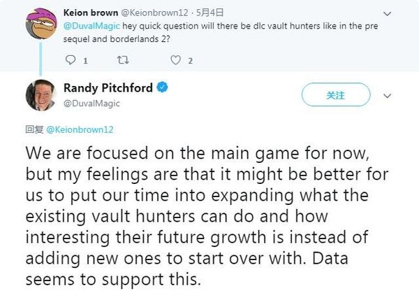 无主之地开发商Gearbox首席执行官Randy Pitchford在Twitter上表示,《无主之地3》将不会在DLC中推出新角色。 “我们现在更专注打磨游戏本体。比起增加新角色,倒不如扩展已有的游戏内容、增加现有角色的成长性和可玩性。数据团队也支持这一点。” 在之前的系列作品里,Gearbox都会推出“宝藏猎人”DLC为游戏增加新的可操控角色。 《无主之地3》将于9月13日登陆PS4/Xbox One/PC平台,支持官方简/繁体中文。 |