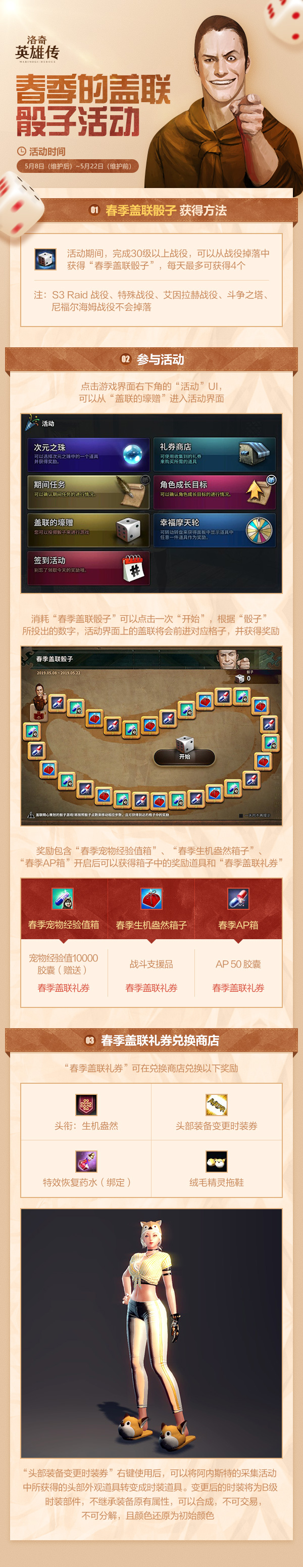 虽说现实世界夏日初临,但春之气似乎更流连于《洛奇英雄传》的艾琳大陆之中,随着气温的节节攀升,一位以“贱兮兮”出名的NPC也蠢蠢欲动起来,不过这次他可是带着礼物出现在大家面前的哦!在5月8日维护后至5月22日维护前,“春季盖联骰子活动”火热开启,完成任务可兑换到专属活动头衔、头部装备变更时装券以及绒毛精灵拖鞋等实用道具哦! 英雄们需要做什么呢?跟着以下步骤完成即可! 拥有“头部装备变更时装券”后即可将阿内斯特采集活动中的头部外观道具转变成B级时装部件,无需诱惑,即可穿戴!是不是很方便呢? 《洛奇英雄传》“春季盖联骰子活动”现已启动,快摇起骰子,将头衔、道具全部拿下吧! 《洛奇英雄传》官网地址>>>http://mh.tiancity.com 《洛奇英雄传》官方微博>>>http://weibo.com/51mh 《洛奇英雄传》运营团队 5月8日 |