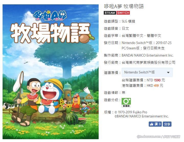 台湾万代南梦宫今日宣布,《哆啦A梦:牧场物语》繁简中文版预定将于2019年7月25日登陆Switch平台,Steam繁简中文版版预计于今年秋季推出。 需要注意的是,Switch日版《多啦A梦:牧场物语》将不包含繁简中文字幕。 游戏截图: |