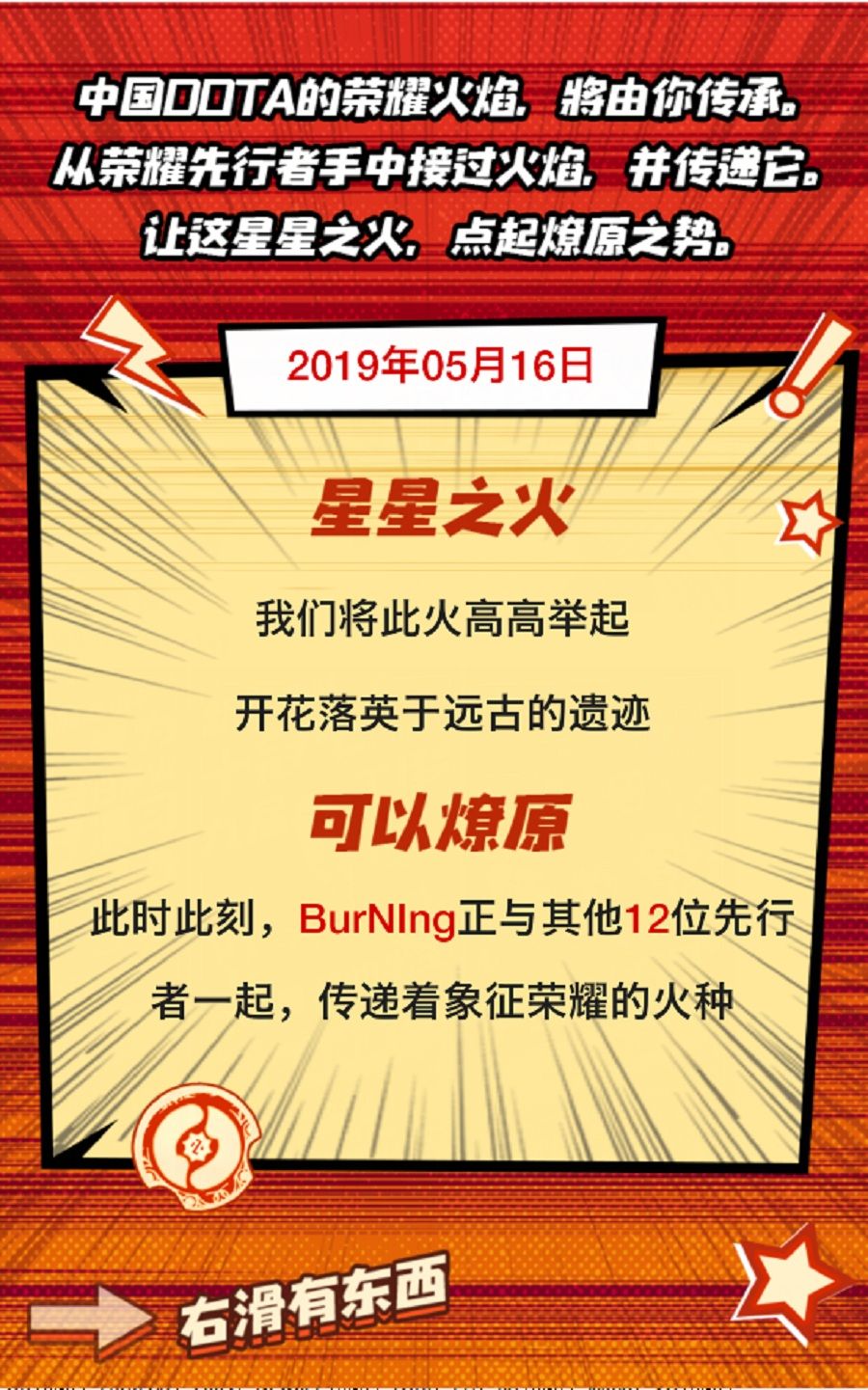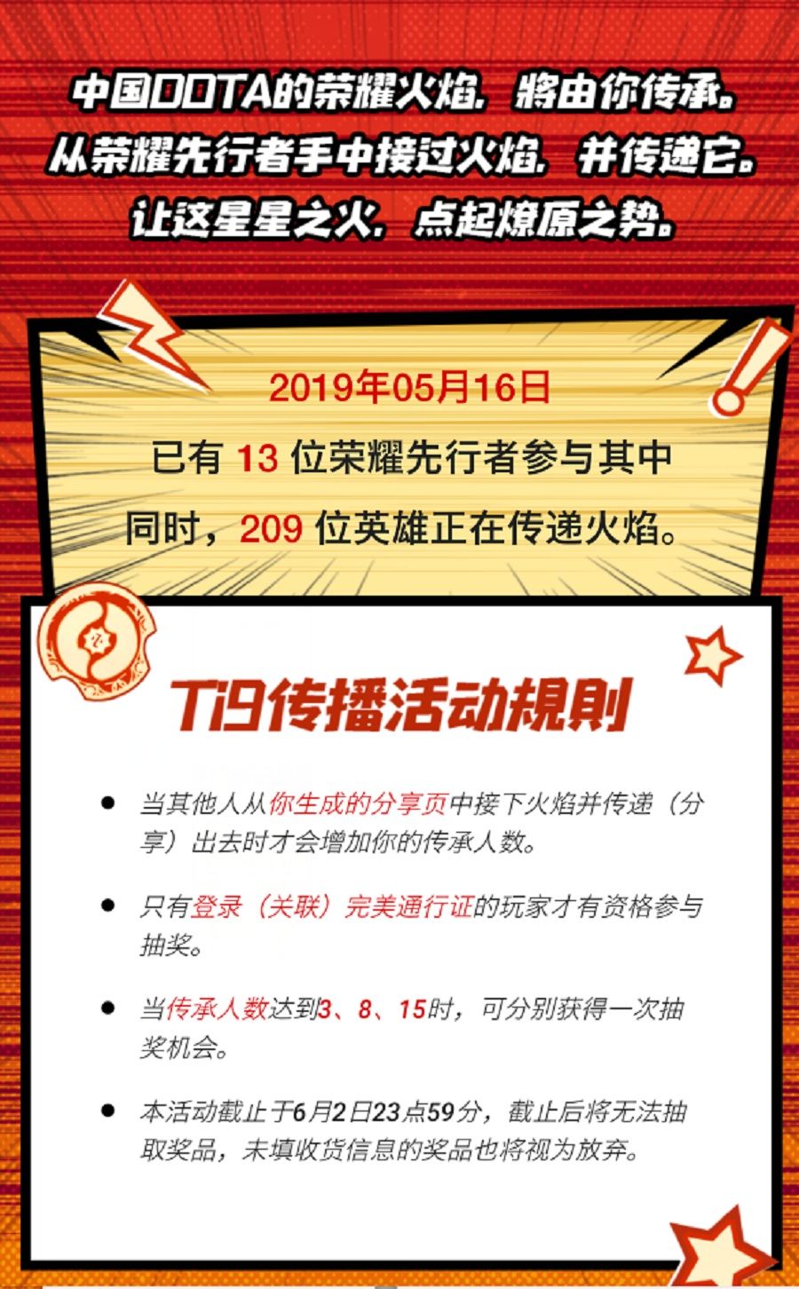 2019DOTA2国际邀请赛勇士令状已经上线,TI9距离我们已越来越近。今年夏天,DOTA2国际邀请赛将首次在中国进行,旷世决战将在上海打响。CN DOTA文化,因先行者们在神州大地上播撒下的星星之火而起,因所有中国玩家对DOTA2的热情而盛,终将在今年八月,于梅赛德斯-奔驰文化中心汇聚成冲天圣火,照亮通往冠军神盾的道路。现在,让我们接过火焰,开始》》》TI9 火焰传递《《《https://s.weibo.com/weibo/%23TI9+%E7%81%AB%E7%84%B0%E4%BC%A0%E9%80%92%23?from=default。 【梦想传承 荣耀先行者传递火焰】 他们中,有人开启了CN DOTA的黄金时代;有人曾获得TI冠军,身披国旗为国争光;有人正为了梦想和荣耀执着前行,只为将冠军盾留在中国。他们是梦想的捍卫者,他们是传说的亲历者,他们是DOTA2的先行者。先行者的荣耀和过往,也是后来者的方向和向往。现在,接过他们手中的火种,将DOTA2的火焰传递给更多玩家。 共有十三团火焰从先行者手中开始传递,分别来自: BurNIng、iG战队、OB战队、PSG.LGD战队、2009、Newbee战队、rOtK、YaphetS丶、KG战队、xiao8、VG战队、EHOME战队、RNG战队。 参与活动的荣耀先行者将通过自己的社交渠道发布自己的火焰,之后玩家即可点击传递,接过他们递出的火焰,继续传递给更多玩家。当更多的玩家接下你递出的火种,可为你增加传承点数。 【传递荣耀火焰 抽取DOTA2周边】 TI9能够在中国举办,不仅是几代DOTA选手和从业者用成绩和诚意争取的结果,更离不开广大玩家对DOTA2的极大热情和热切期待。这一次,当火种从先行者手中传出,传递荣耀的玩家们,当然应该分享成功举办TI的消息,共享这份属于全体DOTAer的喜悦。 本活动通过微信和微博两个渠道传播,玩家可直接发送自己的分享页面到社区,号召其他玩家接下火种继续传递。当传承点数达到3、8、15时,分别可以获得一次抽奖机会,抽取刀币、黏土人手办、figma手办等奖励! 需要注意的是,如果需要进行抽奖,必须关联完美通行证才能取得“火焰传承”抽奖资格。本活动截止时间为6月2日23点59分,请玩家及时参与活动。 星星之火,可以燎原。传承中国刀塔的荣耀火焰,继承荣耀先行者的梦想和精神,让我们将DOTA2的精神传递给更多人!英雄,欢迎回来! |