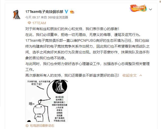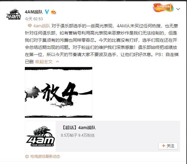 17战队最近有点烦。为什么这么说呢?队伍在最近的比赛当中战绩不佳,居然还上了热搜。更准确地说,他们是被4am战队带着上了热搜。虽然4am战队吃鸡可喜可贺,但是在这条热搜的下面,却有很多账号放出了醒目一颗雷炸死17全队的截图,这也引起了17战队队长shou的不满。 一些围观群众认为是17战队买的热搜,另一些认为是4am买的热搜,不过两支战队经过沟通之后发现,根本不是对方买的热搜,那么4am这个莫名其妙的热搜,似乎就能说明一些问题了。17shou在微博之中也明确表示,此次会公开站出来回应,只针对买热搜的人还有一些无脑的喷子。 从目前的情况来看,两家战队并没有太大的过节。为了消除此次的误会,韦神也亲自和17战队进行了沟通。4am战队和17战队也在微博上发布了相关节奏的说明。黑公关为了挑起电竞圈的战争,真的是不遗余力啊! 通过制造话题带节奏,然后引起双方粉丝的骂战,最后达到离间相关战队关系的目的,似乎已经成为了电竞圈黑公关的标准操作。不过值得庆幸的是,目前的电竞圈还算保持着比较清醒的头脑,一旦出现了节奏,战队也会马上出面平息事端并且告诫自家的粉丝不要被带了节奏,小编觉得还是非常不错的。 不过大家也能够看到,黑公关目前并没有偃旗息鼓,反而有愈演愈烈的趋势。要想彻底摆脱黑公关的影响,在事后告诫粉丝们保持理智是完全不够用的。小编希望有关部门能够注意一下游戏圈的黑公关现象,只有将这群危害环境的害群之马彻底铲除,电竞圈的环境才有可能得到改善。 那么问题来了,各位小伙伴觉得怎么样才能够彻底铲除电竞圈的黑公关呢?欢迎大家在下方的评论区说出你的想法哦! |