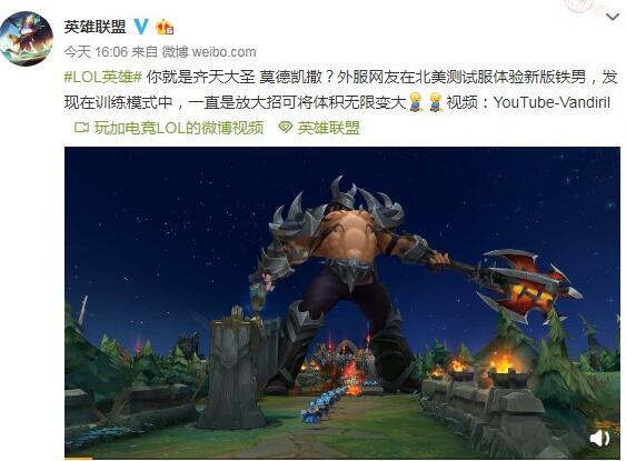 近日,拳头对《英雄联盟》中的铁男进行了重做,而油管主播Vandiril在北美测试服的训练模式中发现,重做之后的铁男可以通过一直放大招令模型无限变大,甚至突破了游戏地图的界限,让我们一起来看看吧! 官方视频链接:https://weibo.com/5720474518/HwANEFfXT?type=comment 在视频中我们可以看到,在一直放大招情况下,铁男的模型可以无限增大,甚至可以超过地图的界限让我们看到游戏地图的远处风景以及背面,而召唤师峡谷在他脚下显得十分渺小,瞬间变成了“进击的铁男”。 有趣的是,这位玩家的发现还引起了@英雄联盟官微的关注,并转发了他的演示,将其戏说为“齐天大圣 莫德凯撒”。 视频截图: |