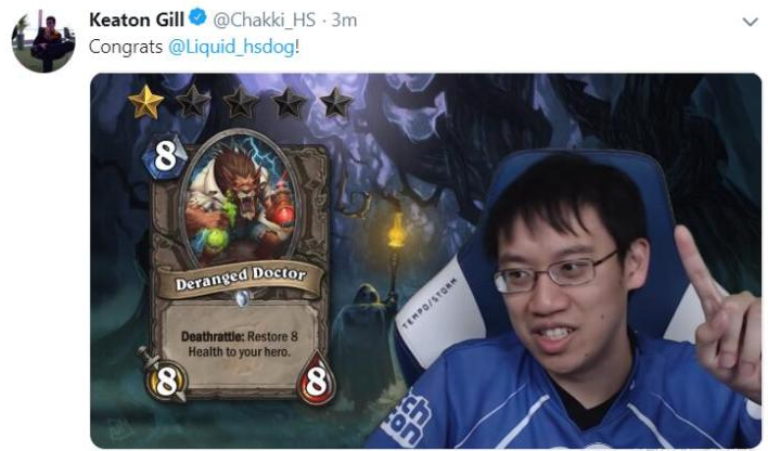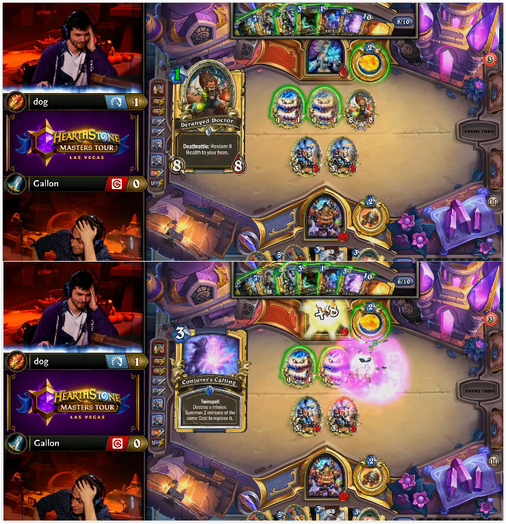 被粉丝们称为“狗哥”的dog是全球人气最高的炉石明星,但他此前却一直还没有拿过什么有分量的大赛冠军,直到最近的拉斯维加斯炉石大师巡回赛,狗哥总算是打破了这个魔咒。 狗哥夺冠使用的是冰法卡组,这就像他一贯以来不随大流的任性风格,在本届大师赛的八强选手中,只有狗哥一人使用冰法。要说这届大师赛最流行的卡组,肯定要数炸弹战了,一共299位选手当中,有103人选择炸弹战,就连狗哥决赛的对手Gallon也是炸弹战。狗哥灵性的在卡组里放进了一张针对炸弹战的癫狂的医生这张单牌,真的在决赛里力挽狂澜了一波。 当时狗哥只剩下了6点生命值,Gallon场上已经有能够造成6点伤害的牌在了,即便这一回合狗哥清场,下一回合Gallon也很有能能够结束比赛。于是狗哥放下癫狂的医生,然后使用咒术师的召唤触发癫狂的医生的亡语,自己回复了8点生命值,同时召唤出两张8费随从。这波操作连设计师Chakki都忍不住在线为狗哥的机智点了个赞。 狗哥力挽狂澜的关键当然是癫狂的医生这张牌,但完成这波操作所需要的却是另外一张牌——露娜的口袋银河。这张牌的效果是让牌库里的随从牌都变成1费,这也是为什么狗哥能够在1回合内同时使用原本8费的癫狂的医生和3费的咒术师的召唤。 从狗哥比赛的卡组配置可以看出,癫狂的医生并非必备卡,只是在那一局比赛里起到了出其不意的效果。而露娜的口袋银河则是每一局都会配备的卡,狗哥的卡组大概思路是用冰法的技能牌来控场,然后铺高费大型随从,露娜的口袋银河就是狗哥铺场的关键牌。 这套夺冠卡组大家也可以自己来试试,欢迎大家在评论区交流试验心得哦! |
